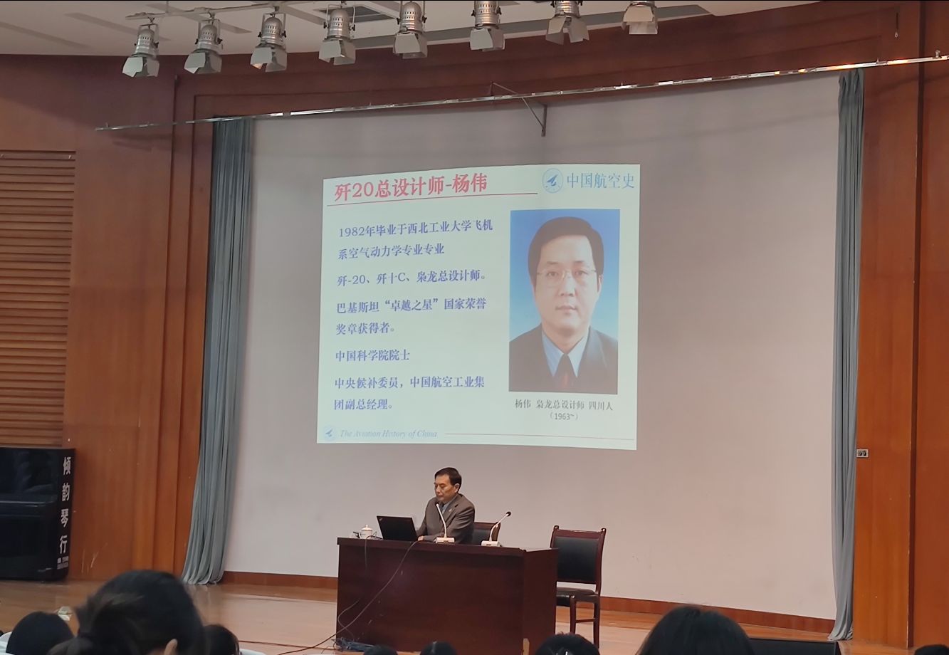 李华星教授在报告中以通过介绍过去航空落后的屈辱历史到现代我国航空国防力量的增强进行开篇。对“运歼直”20家族和中国民机三朵花的设计理念、制造历程进行了详述,特别是对各机的总设计师进行了介绍。同时对中国航空航天科技的奠基人钱学森的爱国热情,为航空航天事业奉献的事迹及精神进行了分享。最后指出了中国航空爆发式增长具有深厚的精神力驱动,源于热忱的爱国情怀,艰苦奋斗的精神,不屈不挠的韧劲和始终如一的执着。