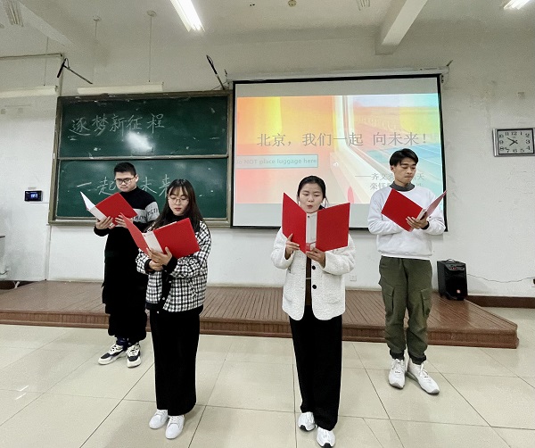 在本届冬奥会中,中国体育代表团全项目参赛,用9金4银2铜、15枚奖牌、金牌榜第三的冬奥会历史最佳成绩交出了一分令人骄傲的答卷。同学们一同重温了我国冰雪健儿奋勇争先、为国争光的高光时刻,分享了奖牌背后不为人知的感人故事,2020级学生刘正倾情演唱的冬奥会主题曲《一起向未来》将课堂气氛推向高潮,由四名同学带来的朗诵《北京,我们一起向未来》,歌颂了运动员们驰骋冰雪赛场、用激情与奋斗诠释青春的拼搏精神,歌颂了我国坚持绿色办奥、开放包容的大国风范,激发了同学们胸怀祖国的爱国情怀,凝聚起了广大青年团结一心奋进新征程的不竭动力。
