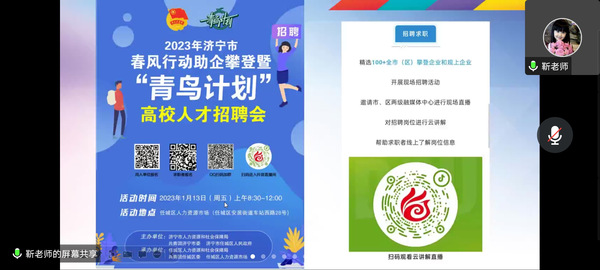 会议伊始,靳老师首先介绍了“青鸟计划·就业服务季”的主要活动内容,包括活动时间、活动内容、工作要求等,各市的招聘启动时间不同,毕业生可以根据自己的需求有选择地进行关注。靳老师鼓励大家切实利用好此次活动,积极参与各地市直播招聘,主动求职,顺利就业。接着,老师说明了现在的就业形势与就业政策,帮助毕业生尽早熟悉就业政策、了解就业现状、把握就业机会,树立正确的就业、择业观念,明确就业目标。老师还介绍了部分地市开展的高校招聘会,参与招聘的企业数量之多,可满足不同毕业生的择业需求,以达到精准就业的目的。最后,老师对同学们进行了就业动员大会,给毕业生同学们恳切的建议,从自身角度提高自己的综合素养,从现在起就为将来准备着,给自己创造更多的机会。明确个人就业方向、根据实际情况调整就业预期、把握整体就业节奏、学会获取学校和社会就业信息资源,特别是重点关注相关就业网站信息,抓住就业黄金期就业择业。至此,2023年“青鸟计划·就业服务季”活动推进会圆满结束。