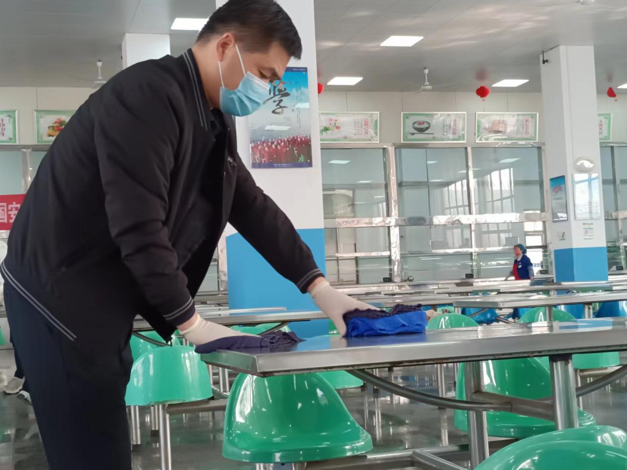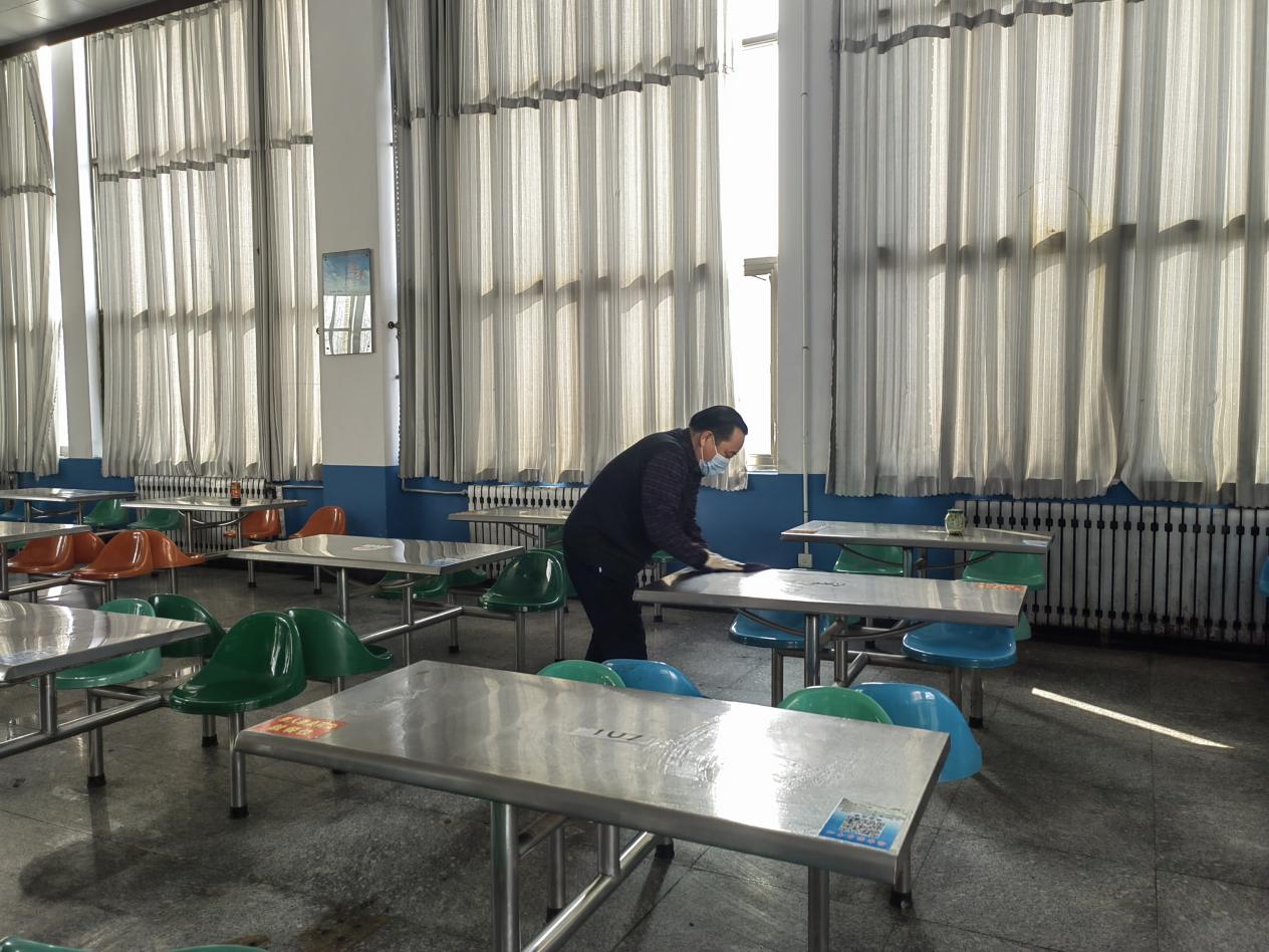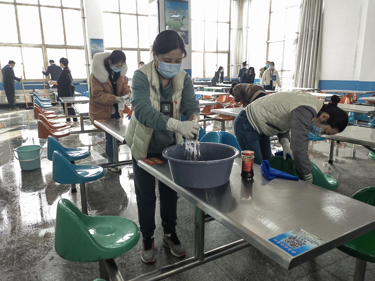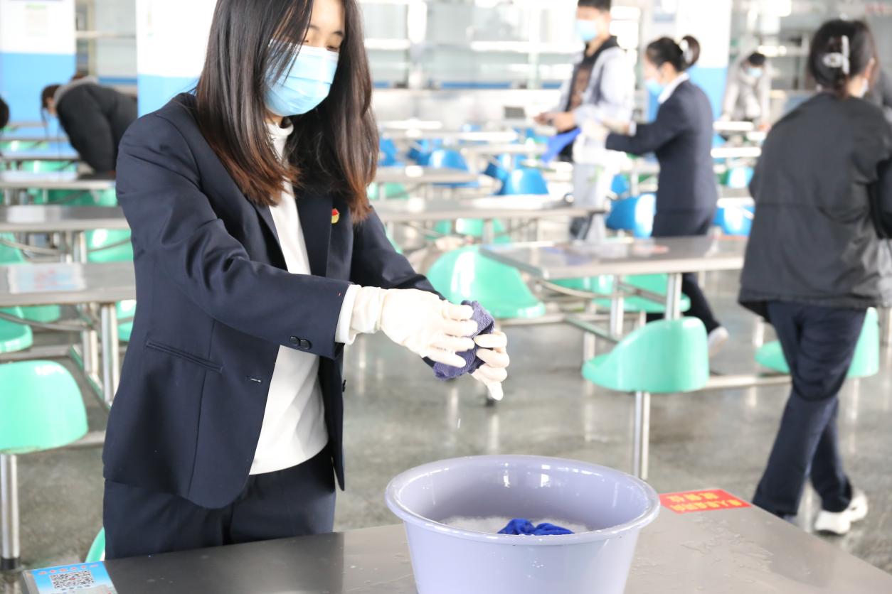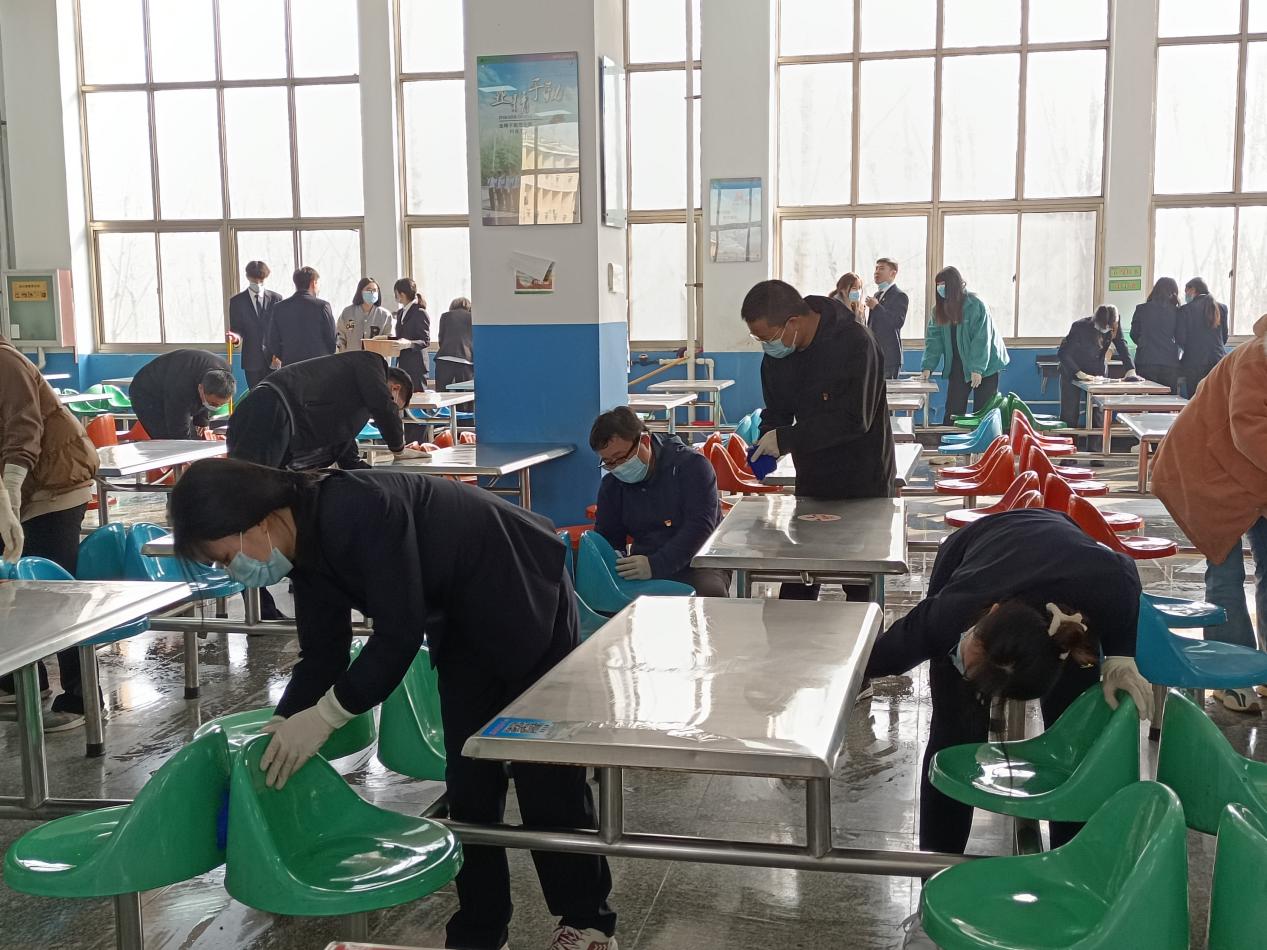 党员志愿者们对学校第一餐厅开展环境卫生清理活动。大家用手中的抹布认真擦拭着餐桌、餐椅,用拖把洗刷脏污的地面,用钢丝球仔细清洁平时不注意的卫生死角和盲区。经过大家的默契配合与共同努力,给就餐师生营造了一个干净整洁的用餐环境。