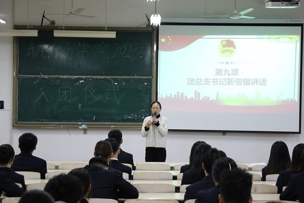 接着,新发展团员代表田丁依发言,她表示以更高的标准严格要求自己,青年大学生使命在肩,责任重大,争做有理想、敢担当、能吃苦、肯奋斗的新时代好青年。团员干部代表卢衍鹏向新发展团员表示祝贺,希望他们在团组织的领导下,努力学习,不断提升个人综合素质,争做一名合格共青团员。