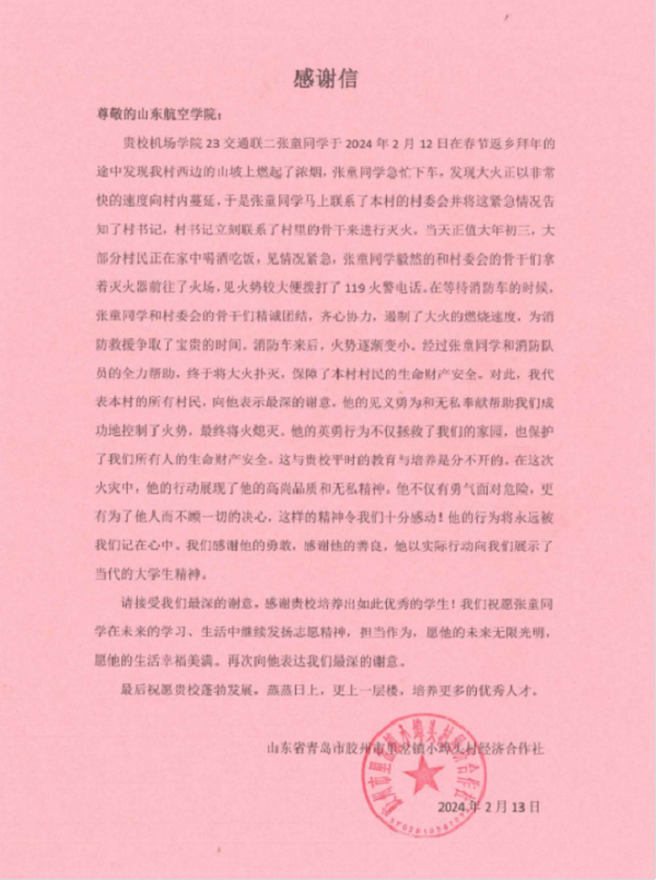 开学伊始,学校收到了一面写有“遍栽桃李树 广育栋梁材”8个烫金大字的锦旗和一封情真意切的感谢信。原来,在过年期间,青岛胶州市里岔镇小埠头村发生大火,我校vwin德赢ac米兰官方网张童同学发现火情后,第一时间吹响了“预警哨”,协助村干部成功控制火势,为消防救援赢得了时间。