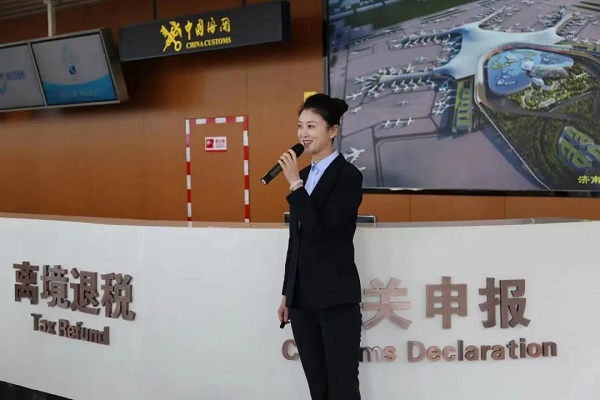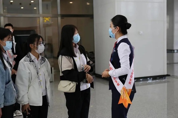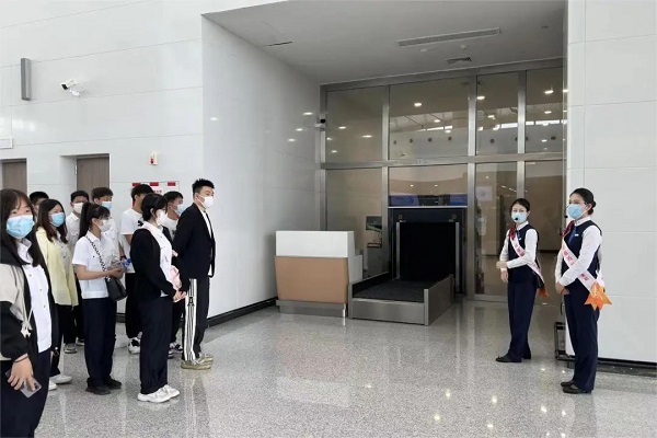 随后,工作人员带领同学们近距离参观安检待检区、值机办理、行李安检、总服务台等区域,了解工作人员为旅客安全登机需要做好的各类服务和准备工作。同学们向南行至航站楼主楼二楼值机区域,沿途参观国内值机柜台、总服务台、售票综合柜台,相关部门工作人员现场解答学生的提问,根据参观路线,同学们认真参观、认真学习,结合课堂知识向工作人员请教。