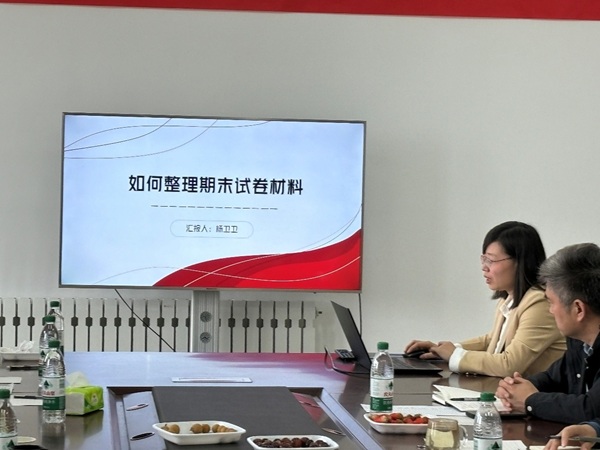 会议伊始,杨卫卫结合实例围绕“期末试卷材料归档规范”展开讲解,从试卷的命题规范、排版格式,到考试过程中的监考记录、考场情况登记表,再到阅卷环节的评分标准、成绩登录与复核,以及试卷分析报告的撰写等各个方面,都进行了细致入微的说明,并重点强调专业课程与公共课程在标准答案、考核分析等环节的差异化要求。随后,杨卫卫以个人整理试卷为例,详细演示操作流程:优先完成空白试卷与标准答案,依次推进审批表、考核分析,最后同步修订课程大纲,与此同时要确保试卷材料的完整性、准确性和规范性。党委书记陈国林在总结中指出,期末试卷材料是教学过程的重要记录,不仅反映了教师的教学水平和学生的学习效果,也是学院教学质量评估的重要依据,全体教师务必高度重视,严格按照学校的相关规定进行整理,确保期末材料整理工作高效完成。