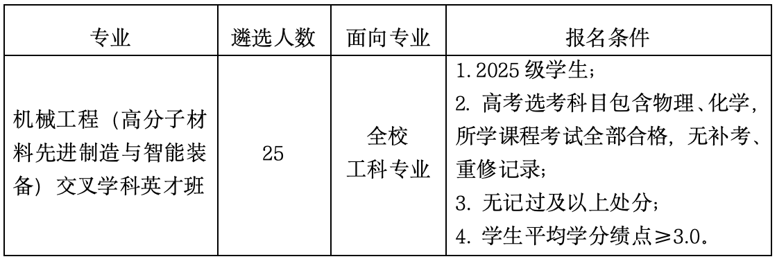 为深入贯彻实施人才强国战略,发扬青岛科技大学“橡胶工业黄埔”鲜明特色,根据《关于开展交叉学科英才班及产教融创卓越班建设工作的通知》、《高分子材料先进制造与智能装备交叉学科英才班建设方案》,现组织开展机械工程(高分子材料先进制造与智能装备)交叉学科英才班(以下简称交叉学科英才班)的招生遴选工作,相关事宜通知如下: