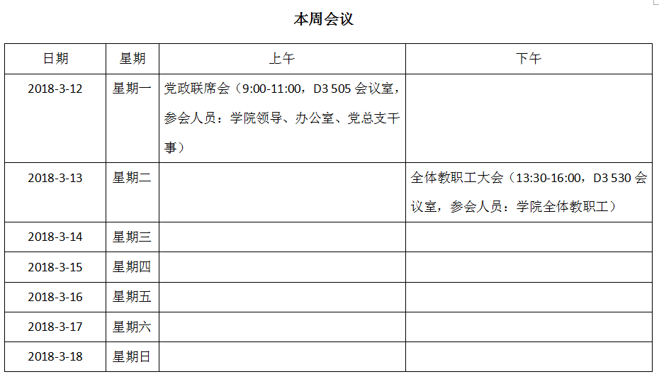各位老师,现将本周会议安排公示,请相关参会人员注意查看,准时参加。