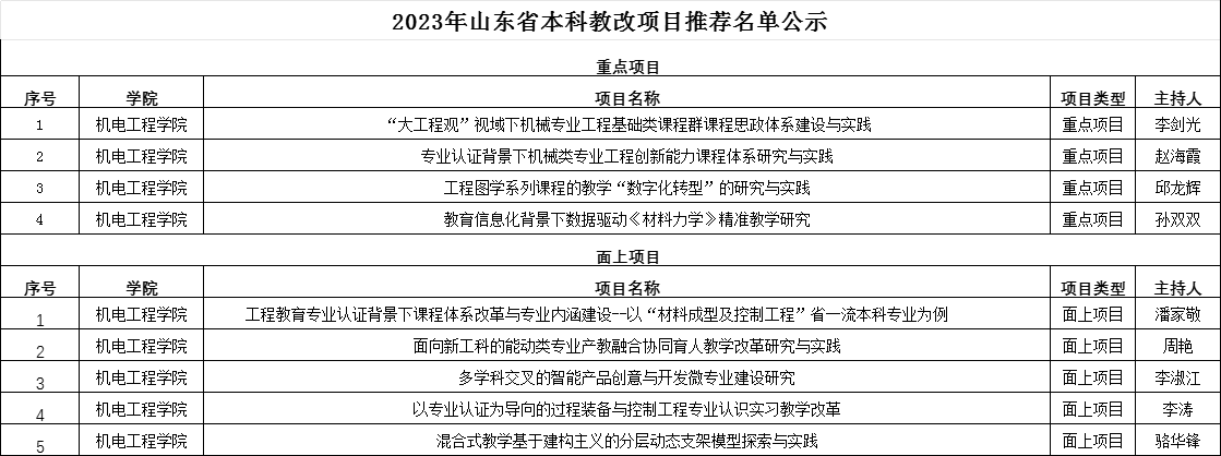 根据学校《关于组织开展2023年山东省本科教学改革研究项目立项申报和管理工作的通知》要求,Beat365官方网站组织开展了省级教改项目申报工作,经项目负责人个人申报,校内专家评审,共拟推荐重点项目4项,面上项目5项,至学校,进行下一步评审。现将结果公示如下: