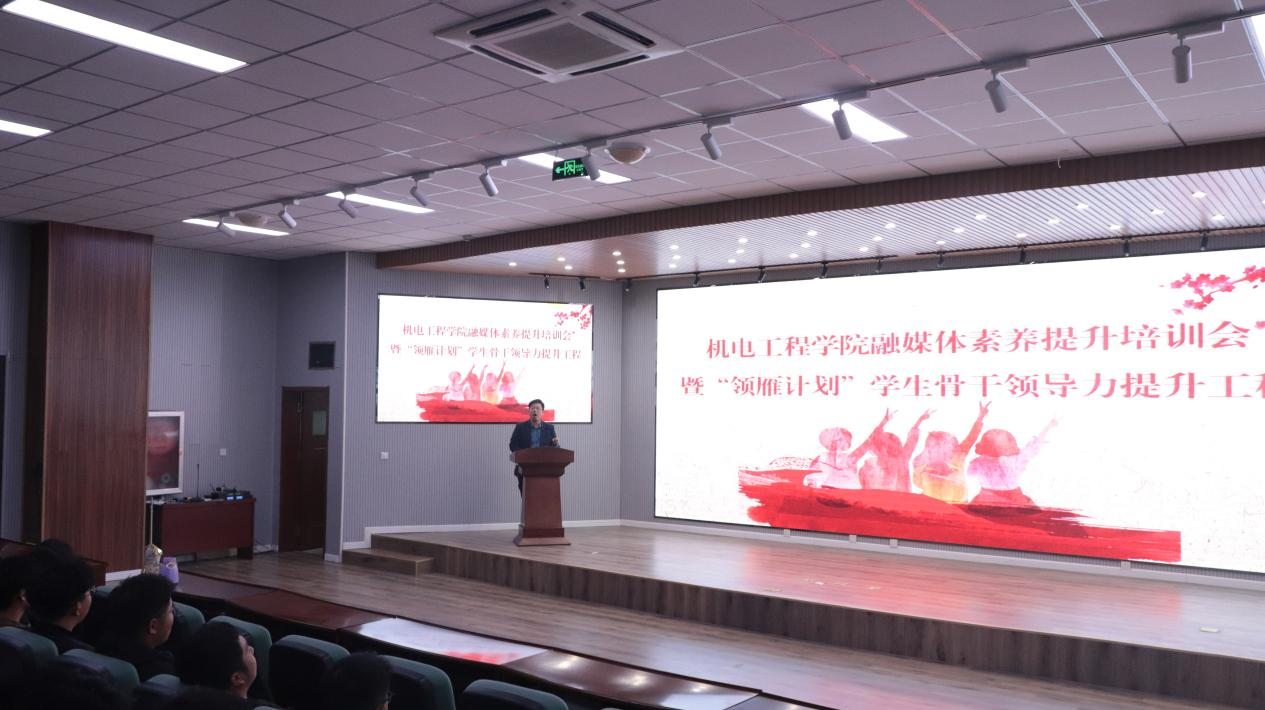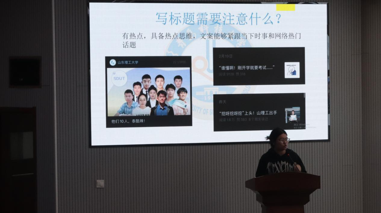 培训会上,学校融媒体中心闫育铭首先介绍了新闻宣传的重要性。随后重点讲解了宣传报道的结构及撰写技巧,从新闻写作、账号定位、标题选取技巧及内容选题等方面阐述了宣传报道的特点和撰写稿件的基本知识。