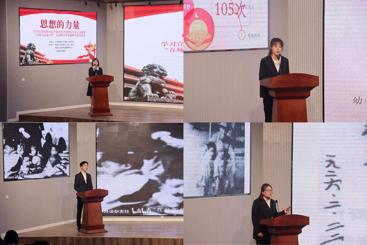 学院“学习习近平新时代中国特色社会主义思想”宣讲团成员吴慧婷、李天扬、崔晨潇分别从脱贫攻坚、沂蒙精神、英雄人物三方面进行《脱贫攻坚:十年奋战圆千秋梦想》《红色基因育千秋,沂蒙精神世代传》《中国核潜艇之父——彭士禄》主题宣讲。