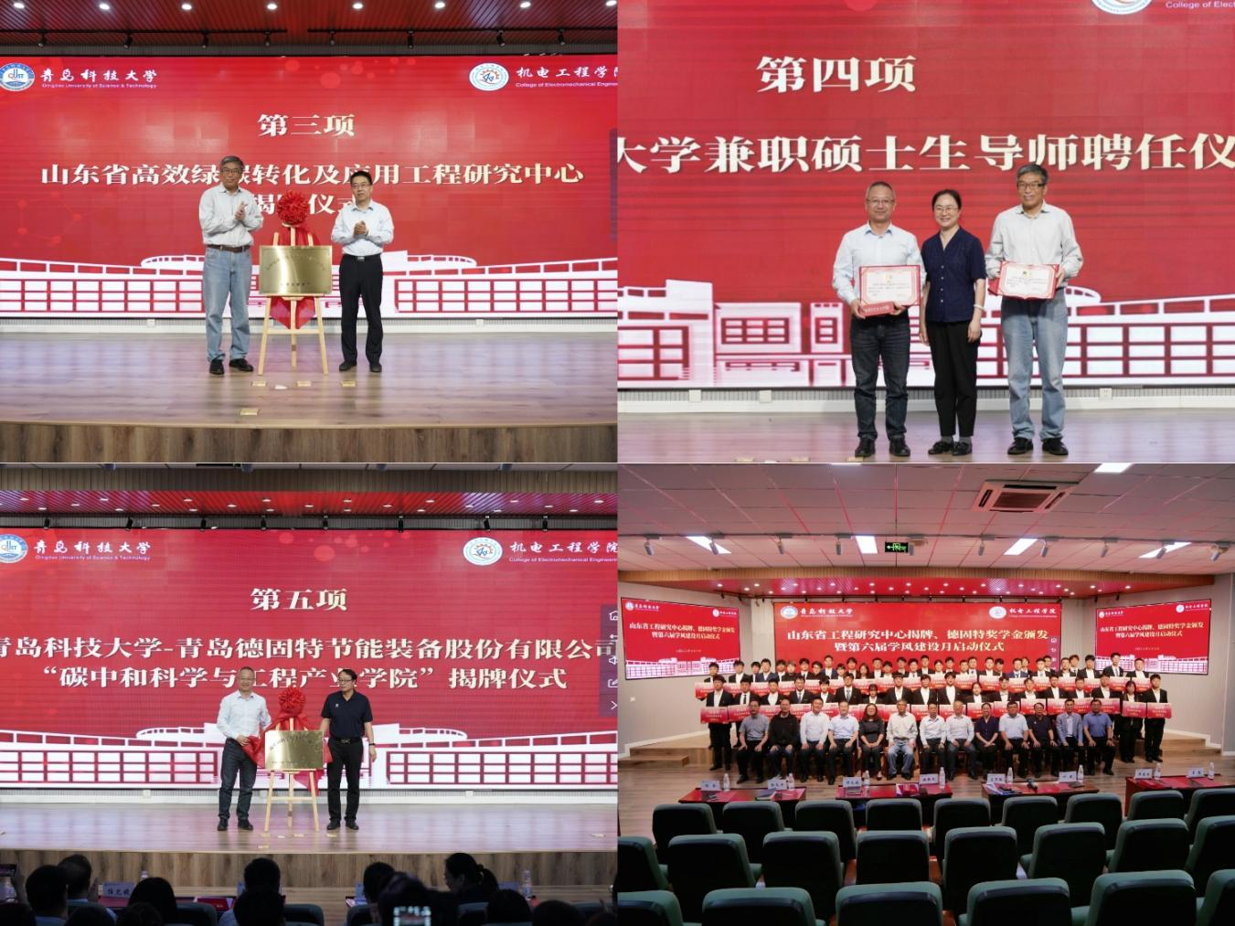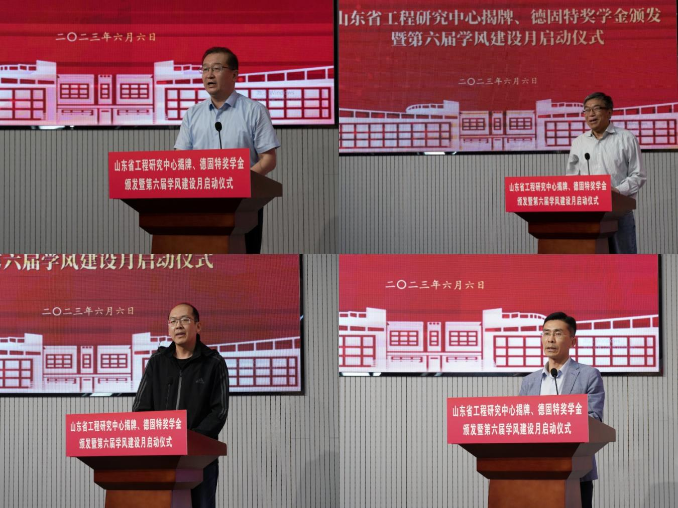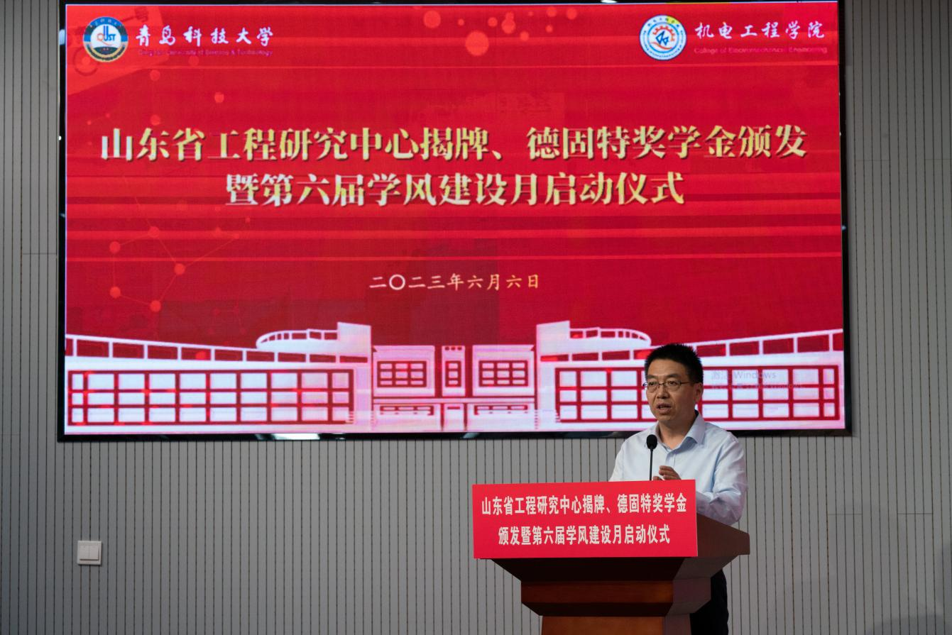 6月6日下午,Beat365官方网站在D3楼530举办山东省工程研究中心揭牌、碳中和产业学院揭牌、德固特奖学金颁发暨第六届学风建设月启动仪式。学校党委常委、副校长吕万翔出席仪式并讲话,学生处、校团委、教务处相关负责人,青岛德固特节能装备股份有限公司董事长魏振文,副总经理崔建波,学院领导班子及师生代表参加会议。会议由学院党委副书记兼副院长肖强主持。