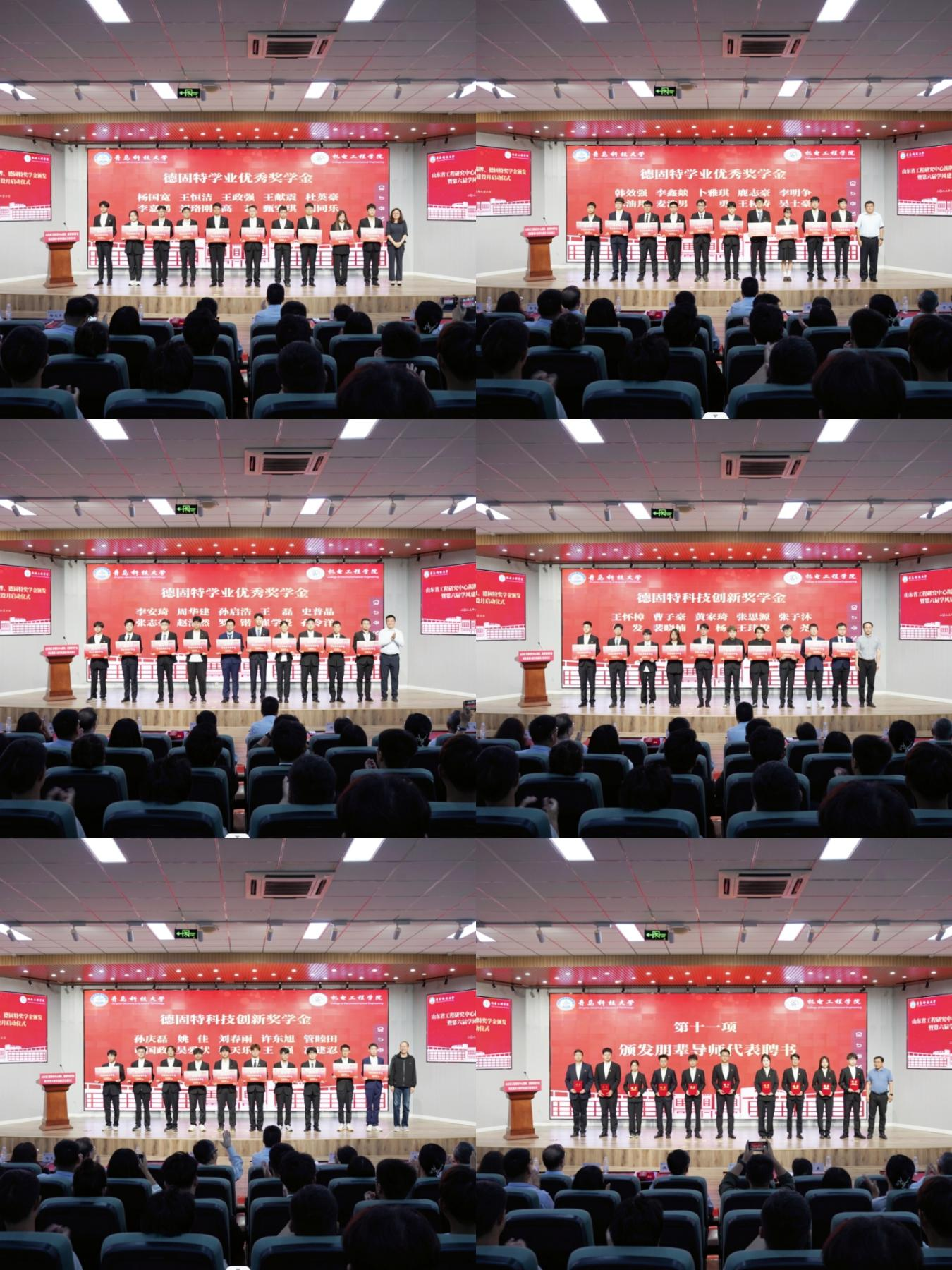 青岛德固特节能装备股份有限公司人力资源部长徐文平、学生工作处副处长宋飞、学校团委副书记陈兵、学院副院长李剑光、张斌为奖学金获得者颁奖。获奖学生代表机械实验201班史普晶同学发言。