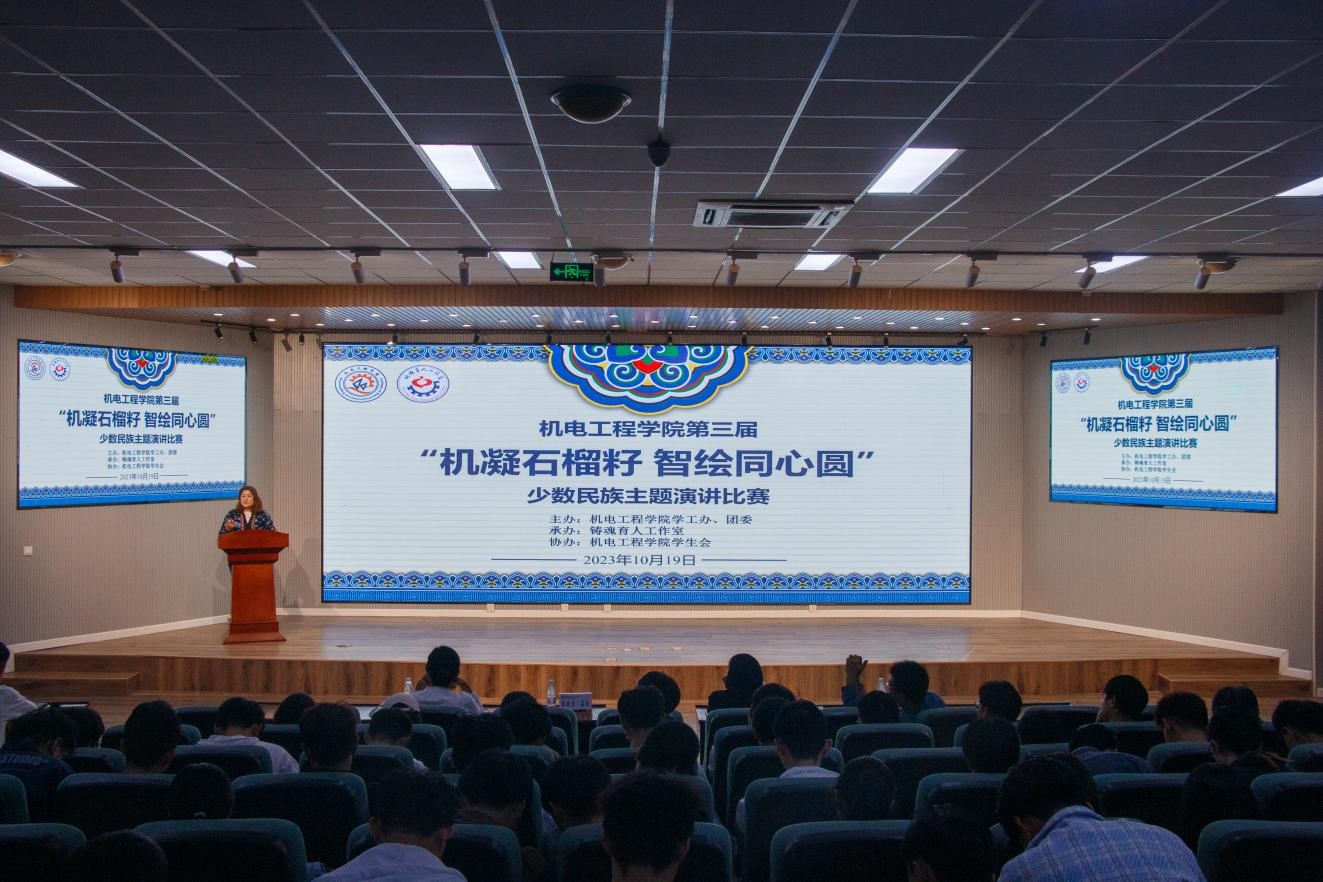 为深入开展学习贯彻习近平新时代中国特色社会主义思想主题教育,进一步加强爱党爱国教育、民族团结进步教育,引导Beat365官网各民族青年学生铸牢中华民族共同体意识,10月19日,Beat365官方网站第三届“机凝石榴籽 智绘同心圆”少数民族主题演讲比赛在Beat365官方网站530报告厅举行。学院学工办主任王娟娟、少数民族专职辅导员热孜亚·茹孜、新生辅导员、青马学员参加此次活动。