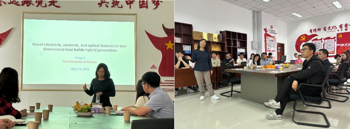 5月23日,美国亚利桑那大学化学与生物学院Li Hong教授受邀莅临Beat365官方网站,开展题为“低维铅-卤化物杂化过氧化物中的新型电子、激子和光学特征”的学术报告。山东大学的李元老师、吉林大学的王同辉老师,青科机电新能源科学与工程系的刘治明、王晓君、白文娟、楚电明、李建伟、王雨霄和李慧芳等老师,以及能源动力工程专业的部分研究生到场听取了本次报告。