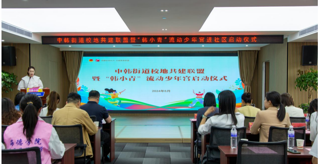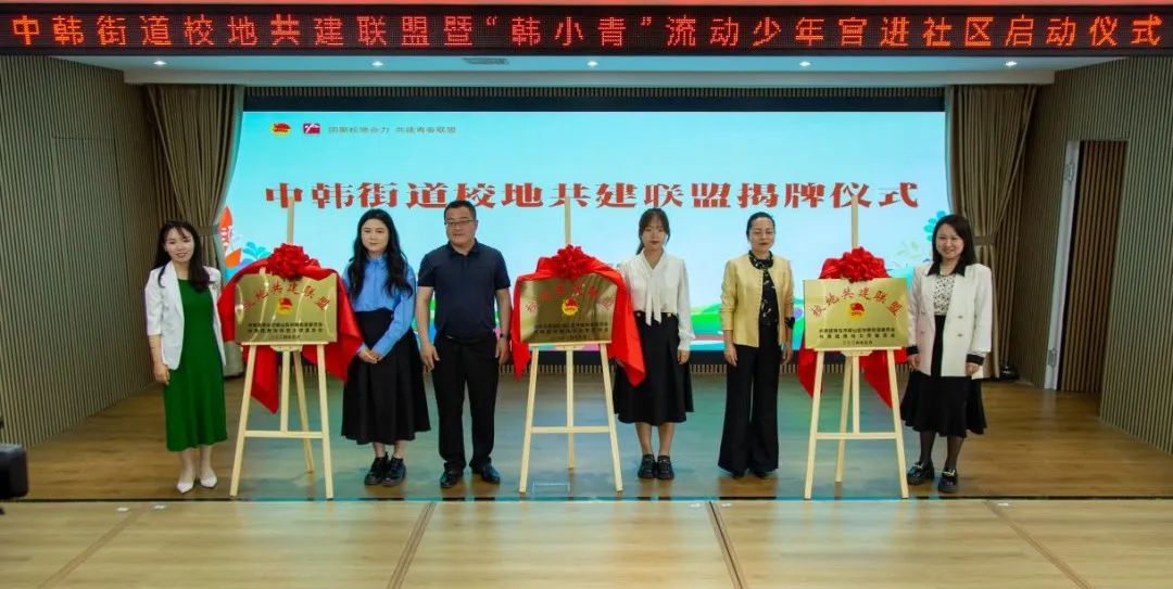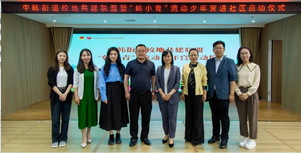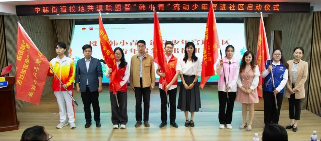 会上,学院与中韩街道举行了校地共建签约仪式和揭牌仪式,讲解了“韩小青”流动少年宫项目,打造传统文化类、指尖文创类、腹有诗书类、艺术熏陶类、动感科技类、青春导航类形体礼仪类、法制宣传类、安全自护类少年宫课程,并对青年志愿者代表授予“韩小青”流动少年宫进社区青年服务队出征旗。