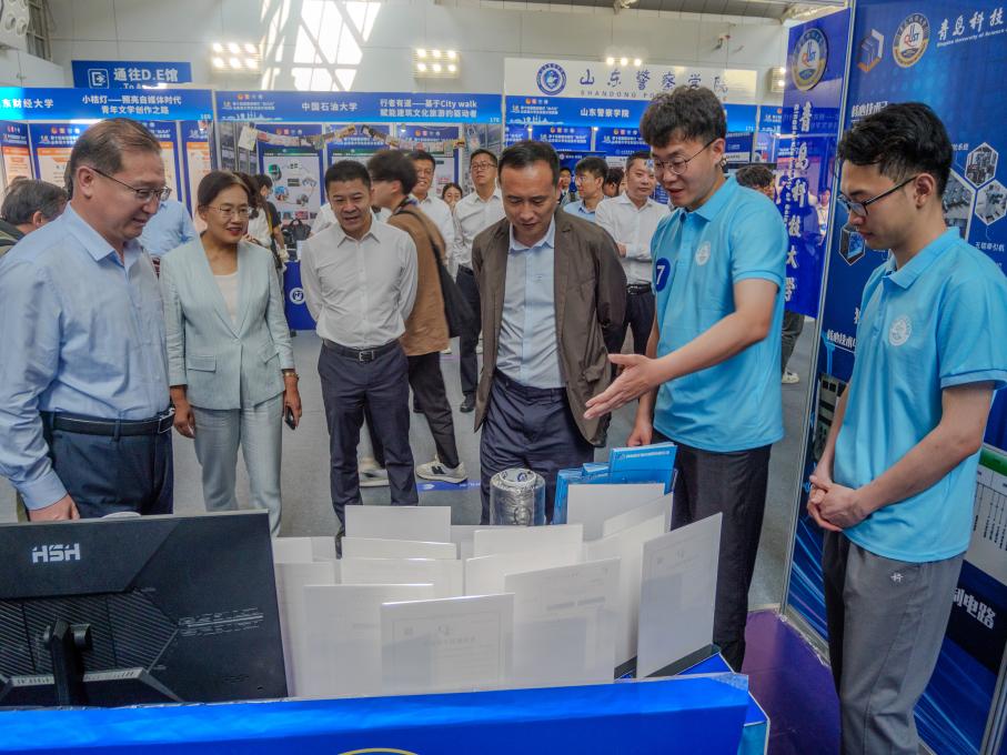 决赛期间,共青团山东省委书记殷世逸一行看望Beat365官网参赛作品展区,听取作品情况汇报,与参赛同学亲切交流,勉励广大学子勇担时代使命,厚植创新沃土,激发创造潜能,为中国式现代化挺膺担当。