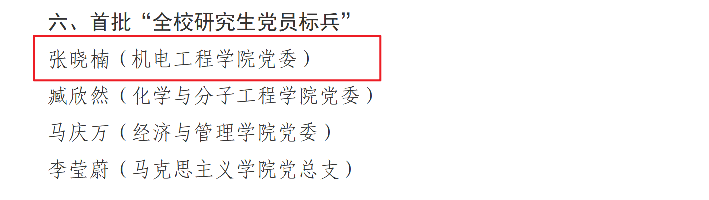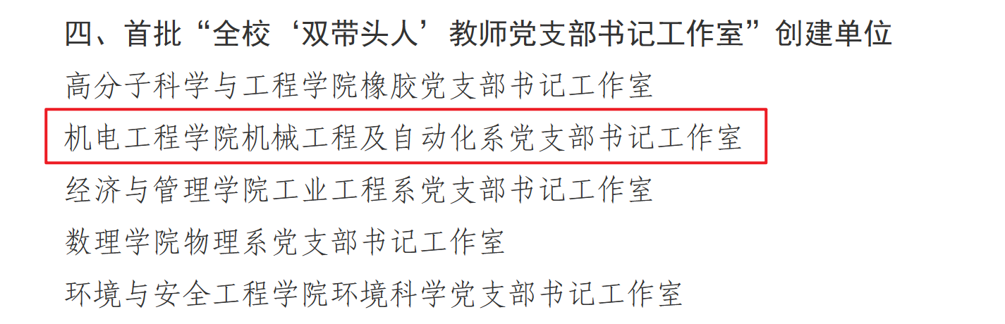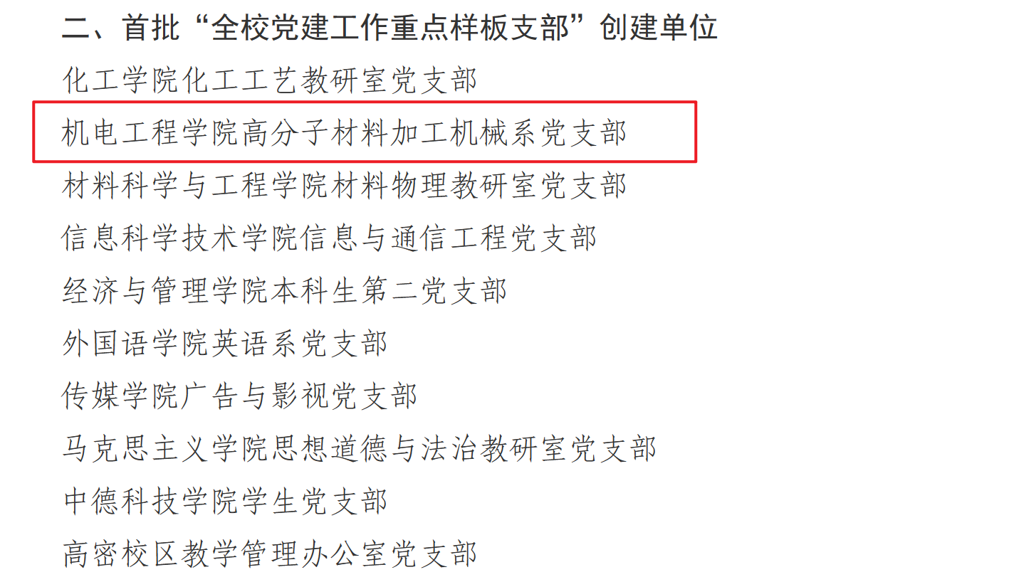 Beat365官方网站党委荣获多项佳绩,其中,学院党委入选首批“全校党建工作标杆院系”创建单位,高分子材料加工机械系党支部入选首批“全校党建工作重点样板支部”创建单位,机械工程及自动化系党支部书记工作室入选首批“全校‘双带头人’教师党支部书记工作室”创建单位,2022级硕士研究生张晓楠入选首批“全校研究生党员标兵”。