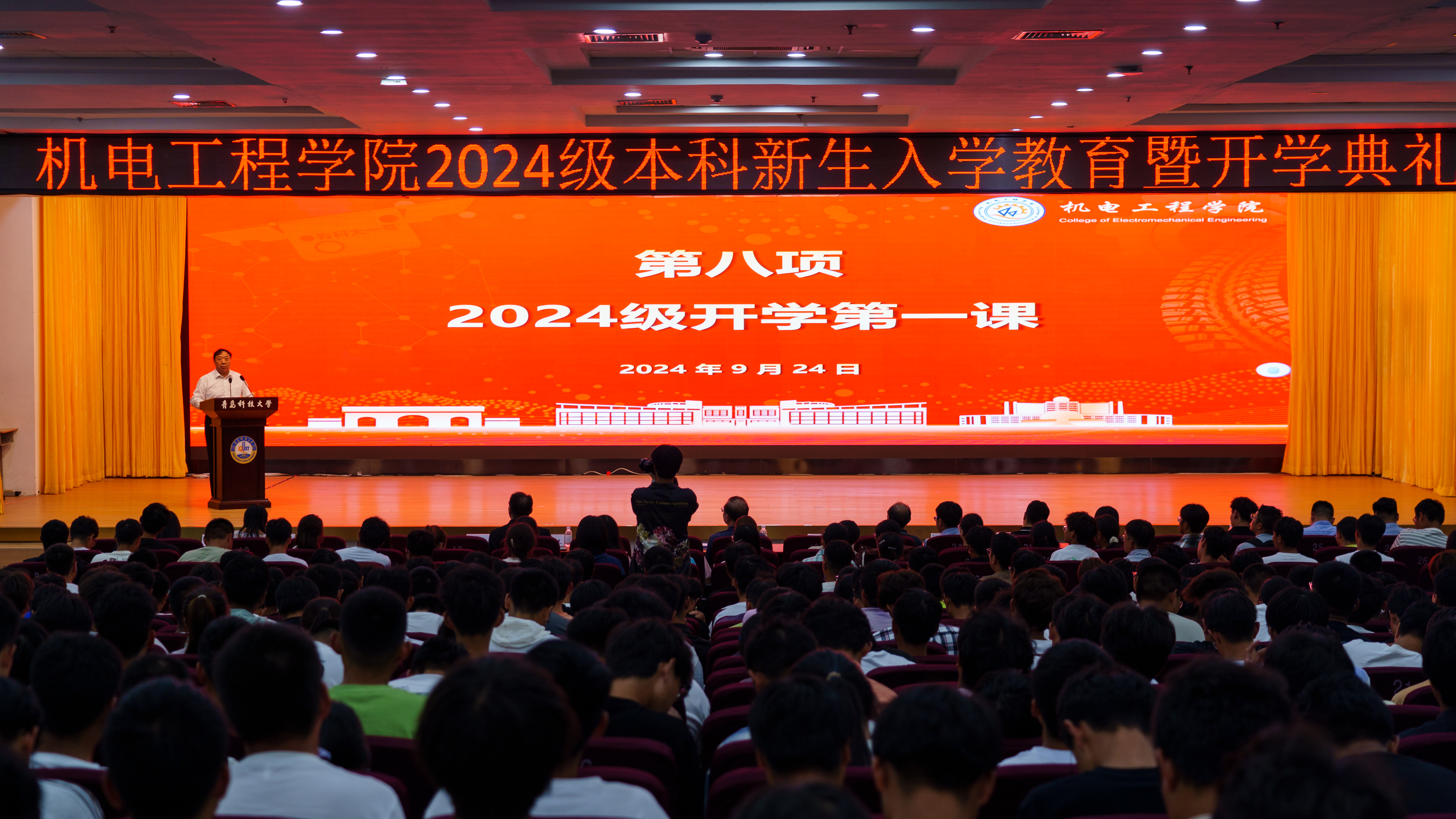 9月24日,Beat365官方网站2024级本科新生开学典礼暨入学教育在崂山校区第二报告厅、明德楼教室举行。学院党委书记任允晓、轮胎先进装备与关键材料国家工程研究中心主任汪传生、学院党政领导、各专业教研室主任、党支部书记、班主任代表、全体辅导员、854名本科新生参加典礼。