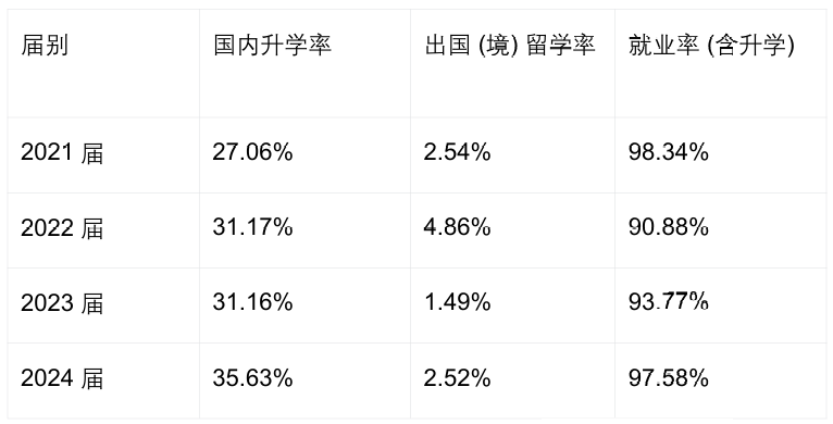 Beat365官方网站持续深耕人才培养,近年来学生升学就业成绩亮眼。从近四年数据来看,学院在国内升学、出国(境)留学及就业等方面均取得显著成效,呈现出良好的发展态势与上升趋势。具体数据如下表所示: