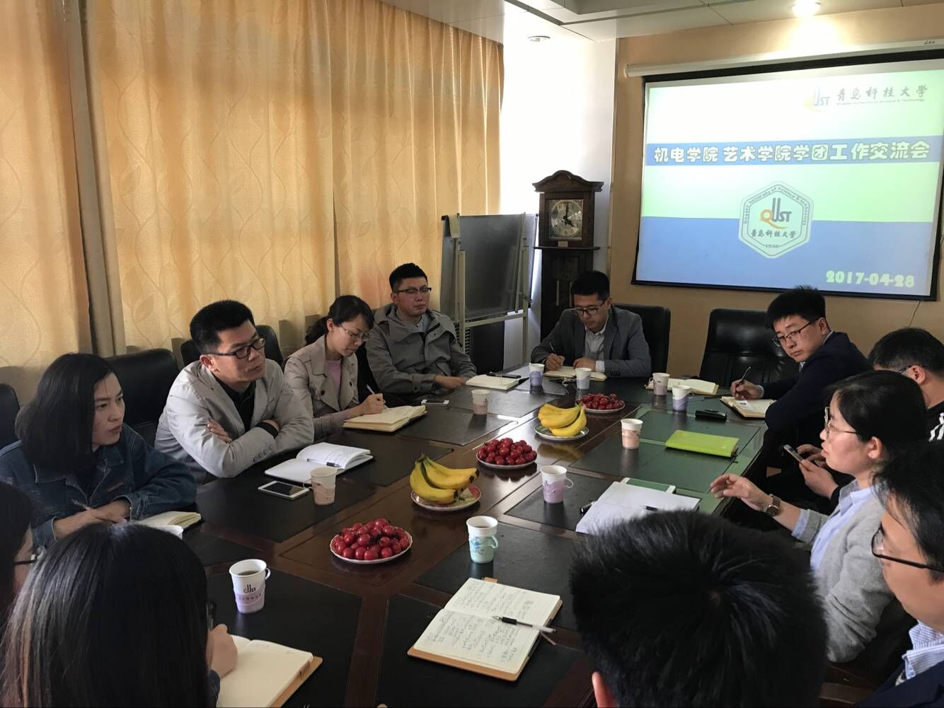 为加强团学工作交流,扎实做好团学工作。4月28日下午,艺术学院党总支副书记兼副院长刘明森及分团委全体专兼职辅导员一行8人到Beat365官方网站进行学团工作交流,Beat365官方网站党总支副书记兼副院长王伟,分团委老师参加了本次交流会。