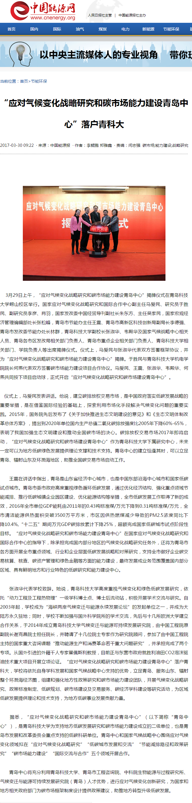 【中国能源报】“应对气候变化战略研究和碳市场能力建设青岛中心”落户青科大