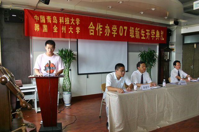 会上,校党委副书记韩兆会首先代表学校向新生致辞,对他们表示了热烈的欢迎和诚挚的祝贺,韩书记为新生介绍了学校的概况,希望大家要秉承“明德、笃学、弘毅、拓新”的校训,宽厚待人,毅以处事,珍惜大学的美好时光,学有所成。国际交流学院吕院长在会上强调了学习语言的重要性,并传授了新生一些语言学习的方法。Beat365官方网站汪传生院长向同学们介绍了青岛科技大学与韩国全州大学合作办学项目的具体情况,展望了合作办学项目的光辉前景,并鼓励同学们努力学习,创造美好的未来。 教师代表俊熙老师在会上发言,要求同学们养成良好的语言学习习惯,希望同学们取得好的成绩。新老生代表樊宇同学也在会上发言,表示决不辜负领导老师的殷切希望,一定会努力学习,回报母校的教育和培养。