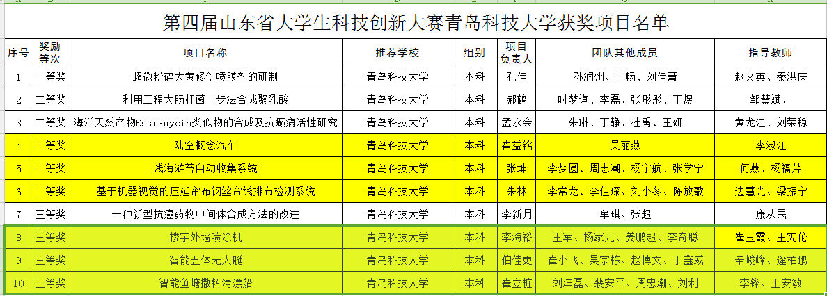 近日,山东省教育厅下发《山东省教育厅关于公布第四届山东省大学生科技创新大赛获奖名单的通知》(鲁教高字[2017]12号)。青岛科技大学荣获优秀组织奖,共荣获一等奖1项,二等奖5项,三等奖4项,其中Beat365官方网站获二等奖3项,三等奖3项,参赛作品数量和获奖数量位居学校前列。