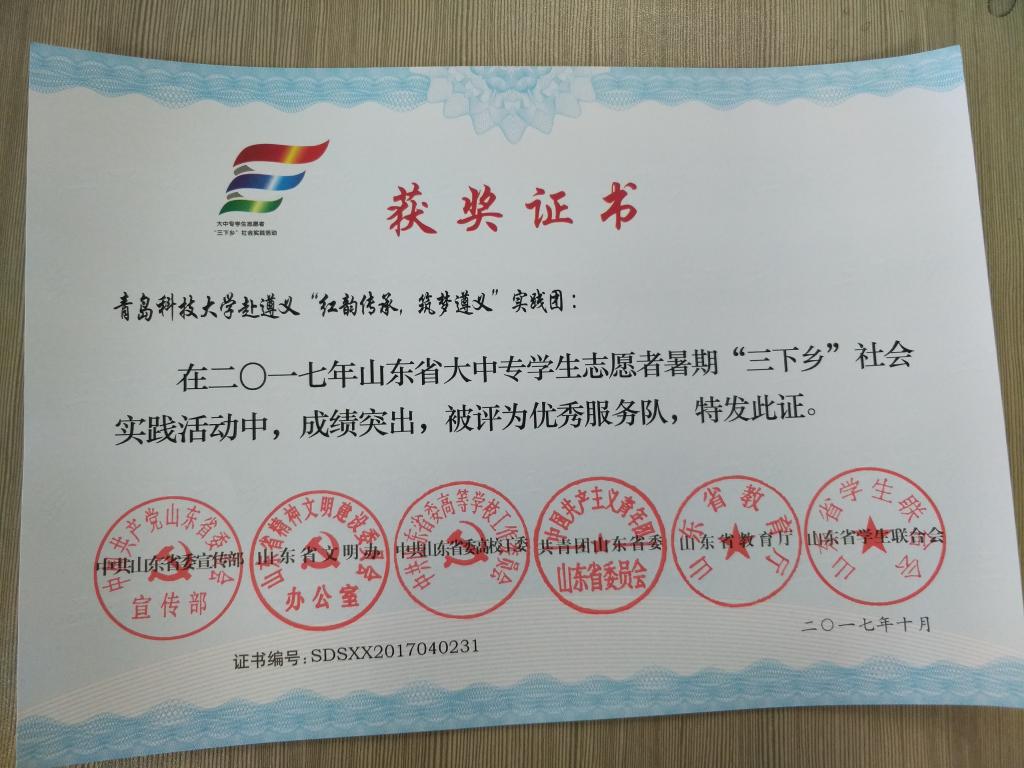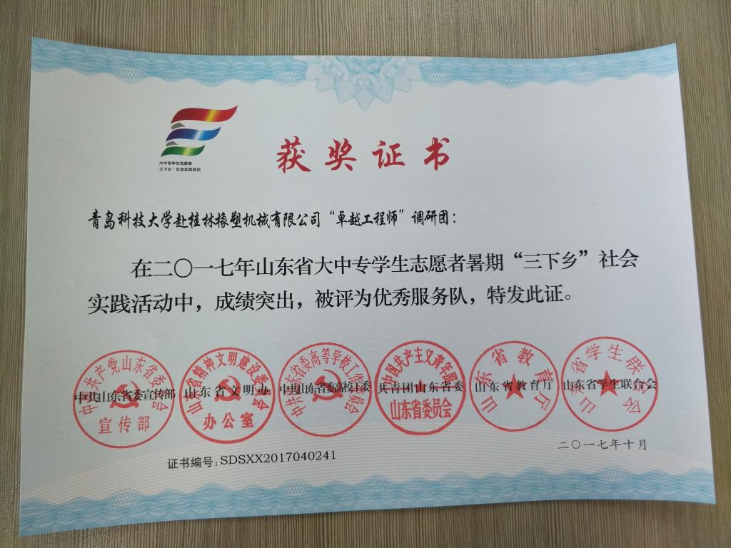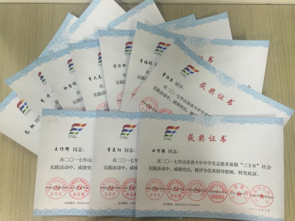 近日,2017年山东省大中专学生志愿者暑期文化科技卫生“三下乡”社会实践活动先进集体和先进个人的证书下发,Beat365官方网站赴桂林橡塑机械有限公司“卓越工程师”调研团、赴遵义“红韵传承,筑梦遵义”实践团2支队伍获得2017年山东省优秀服务队称号,王作辉、曲智强、李东阳被评为2017年山东省社会实践活动优秀指导教师,高翔、李开、冷雪靖、李大志、宋沂轩、李福祯、董佳乐7名学生荣获2017年山东省社会实践活动优秀学生。