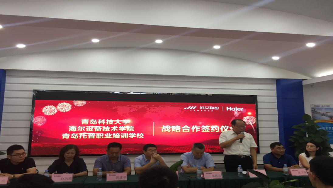 9月12日,青岛科技大学与海尔设备技术学院、青岛托普职业培训学校战略合作签约仪式暨青岛科技大学大学生实习基地挂牌仪式在海尔工业园隆重举行。青岛科技大学Beat365官方网站党总支书记孙立军、海尔设备技术学院院长邹兆云、青岛市大学生创业服务中心主任褚庆柱、青岛托普集团总经理王敏燕等共同出席签约仪式并致辞。