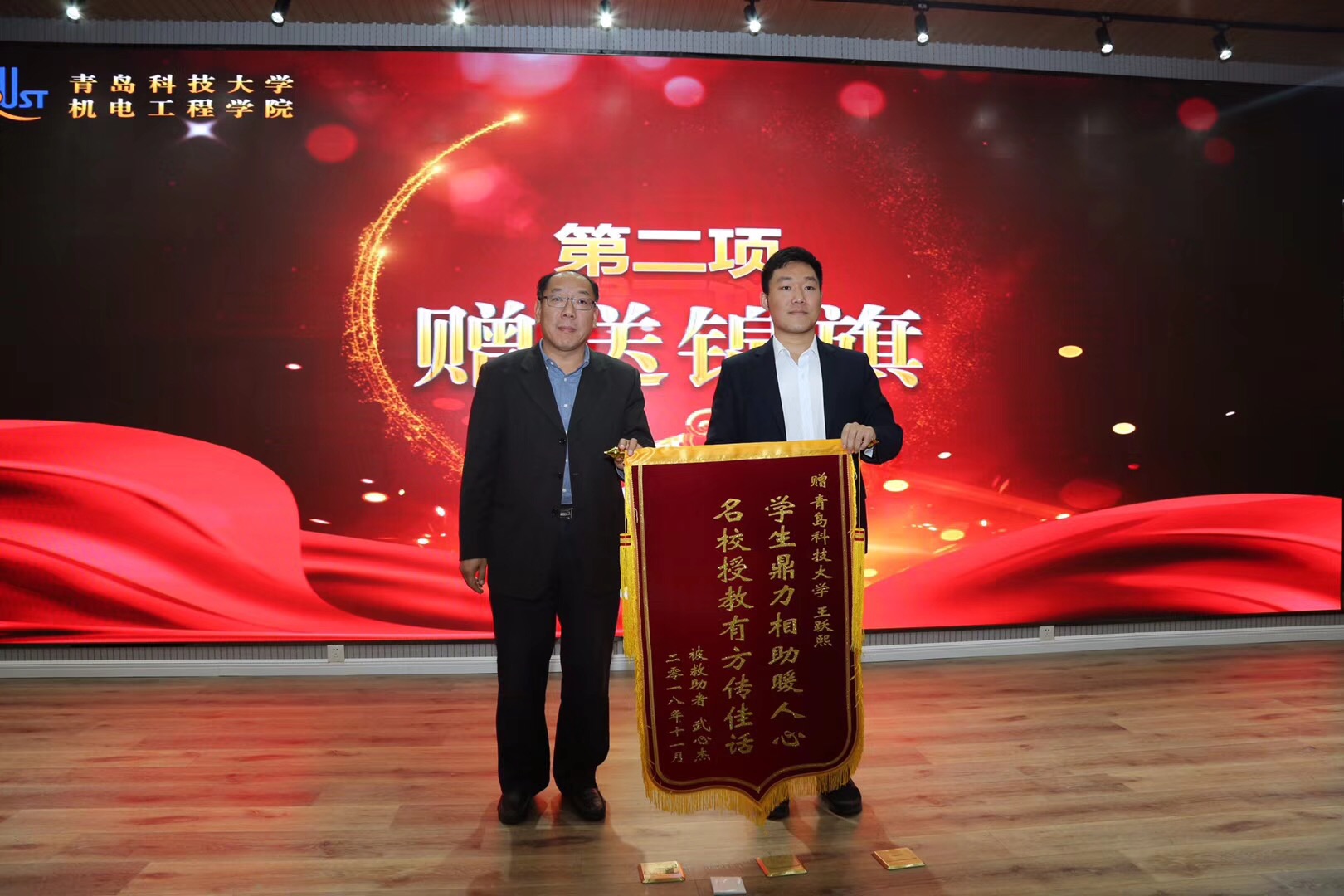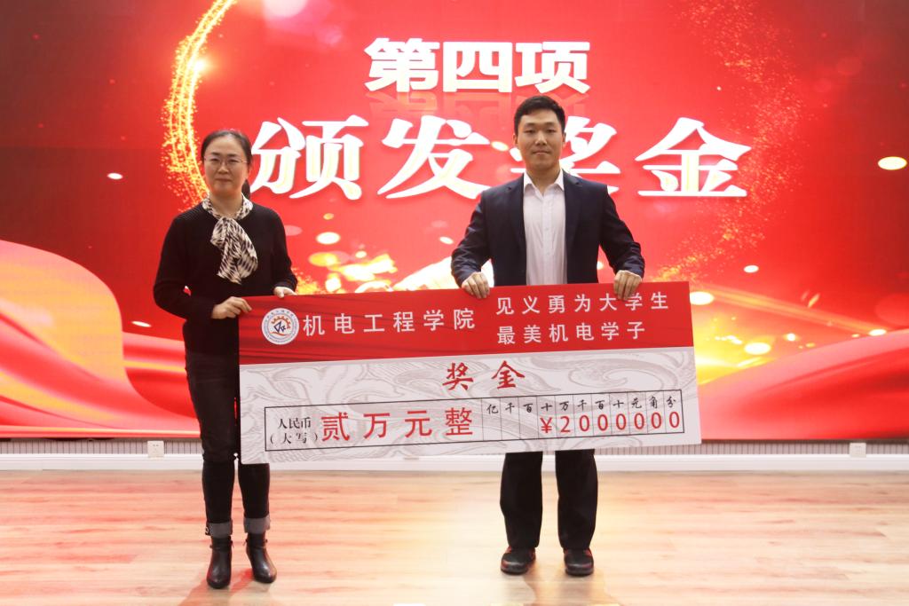 王伟宣读了《关于表彰“见义勇为大学生,最美机电学子”——王跃熙的决定》。孙立军在致辞中为王跃熙同学的义举点赞并对广大同学提出了三点希望:第一,希望同学们心系社会、关心他人;第二,希望同学们助人为乐、无私奉献;第三,希望同学们诚实友善、积极努力。随后,孙立军受被救助者武心杰委托,将一面印有“学生鼎力相助暖人心,名校授教有方传佳话”字样的锦旗送到王跃熙同学手中,并向其颁发了奖状和奖杯。何燕向王跃熙同学颁发了2万元奖金。