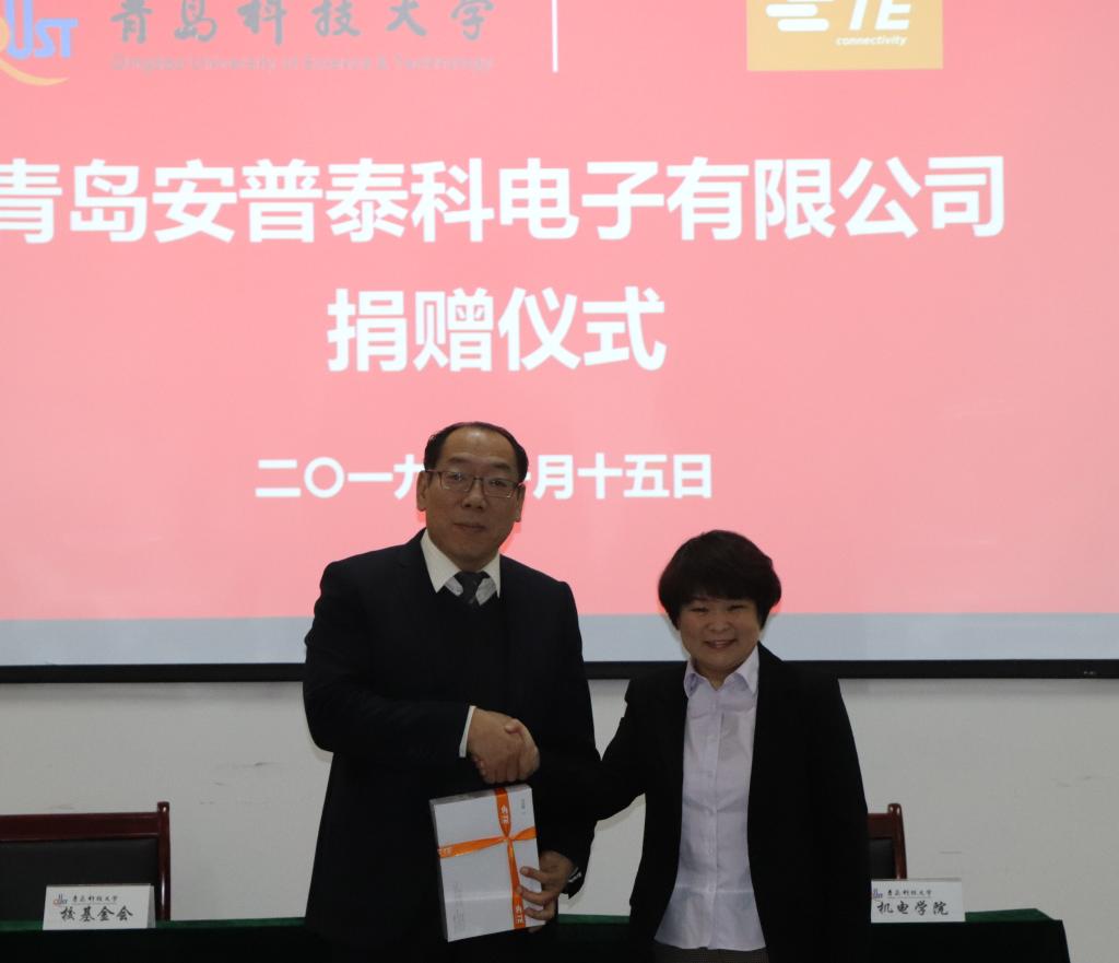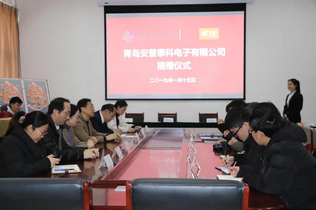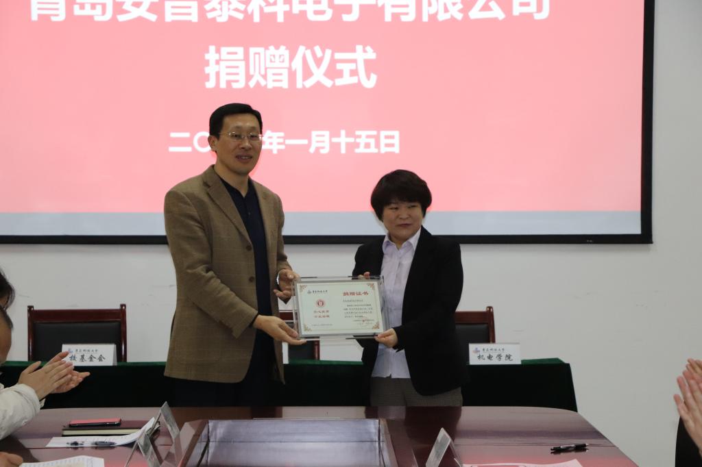 1月15日上午,青岛安普泰科电子有限公司捐赠仪式在机电大楼518会议室隆重举行。校友办主任兼教育发展基金会秘书长聂广明、Beat365官方网站党总支书记孙立军、Beat365官方网站党总支副书记兼副院长王伟、校教育发展基金会基金管理主任顾珊珊、青岛安普泰科电子有限公司总经理刘国庆、人力资源部总经理黄青霞等参加了仪式。仪式由王伟主持。