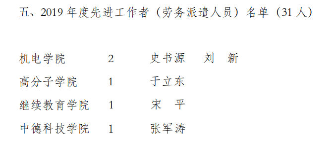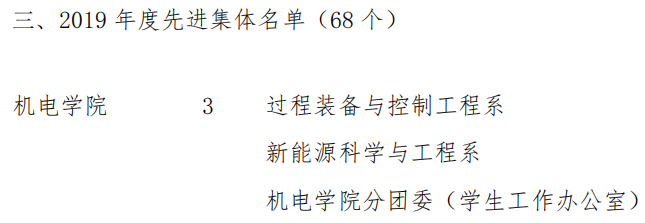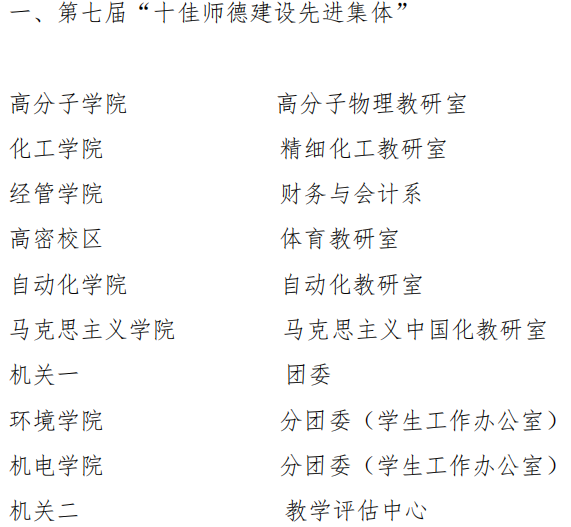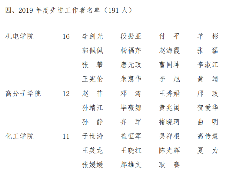 近日,青岛科技大学2019年度先进集体和先进工作者表彰名单公示,Beat365官方网站分团委(学生工作办公室)获第七届“十佳师德建设先进集体”称号,王作辉老师获第十届“十佳育人标兵”荣誉称号,过程装备与控制工程系、新能源科学与工程系、Beat365官方网站分团委(学生工作办公室)获“2019年度校级先进集体”称号,李剑光、段振亚、付平、羊彬、郭佩佩、杨福芹、赵海霞、张猛、张攀、唐元政、曹同坤、李淑江、王宪伦、朱惠华、李旭、黄靖16名老师获“先进工作者”荣誉称号,史书源、刘新获2019 年度先进工作者(劳务派遣人员)。