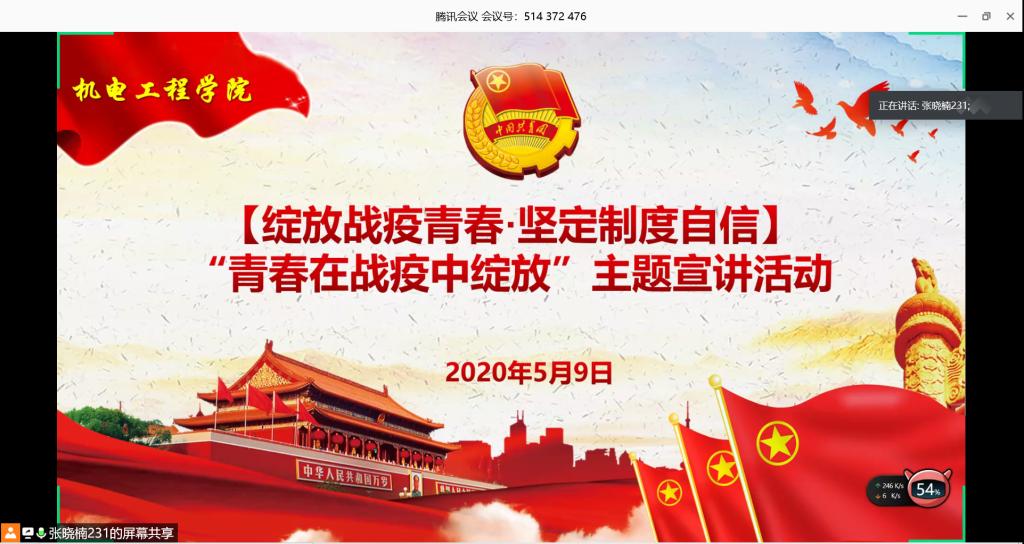 为深入贯彻落实习近平新时代中国特色社会主义思想对青年行动的指导,5月9日,在纪念五四运动101周年、新冠疫情防控阻击战取得重大战略成果之际,Beat365官方网站分团委组织部举办“青春在战疫中绽放”线上主题宣讲活动。分团委组织部部长王娟娟老师出席了活动,罗浩宇、刘龙、马江儒和马元宇四位团员作为机电团员青年战疫典型代表宣讲了他们勇战疫情的青春故事,17级、18级、19级200余名团学骨干通过“腾讯会议”参与了活动。活动由分团委组织部副部长张晓楠主持。
