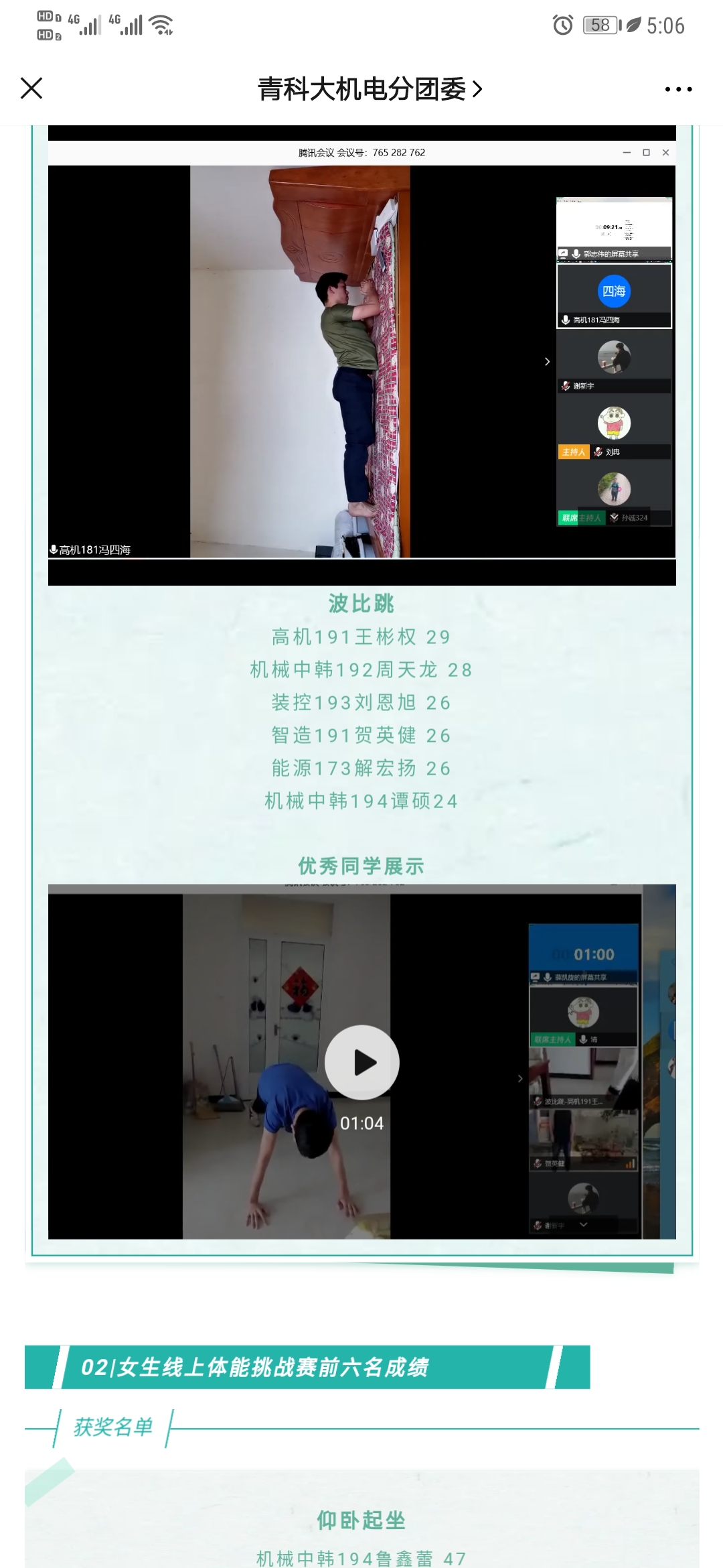 为了响应山东省教育厅和学校关于“线上教育要重视学生心理健康”的工作要求,帮助学生缓解焦虑情绪,活跃学生居家锻炼氛围,Beat365官方网站举办了“莘莘学子共庆七十华诞,矫健英姿同战疫疠瘟情”线上体能挑战赛。比赛分男子组和女子组,男子组项目有一分钟俯卧撑、一分钟波比跳、平板支撑;女子组项目有一分钟仰卧起坐、一分钟开合跳、平板支撑,活动中,选手们在家运动,线上比赛,不断强健学子体魄。