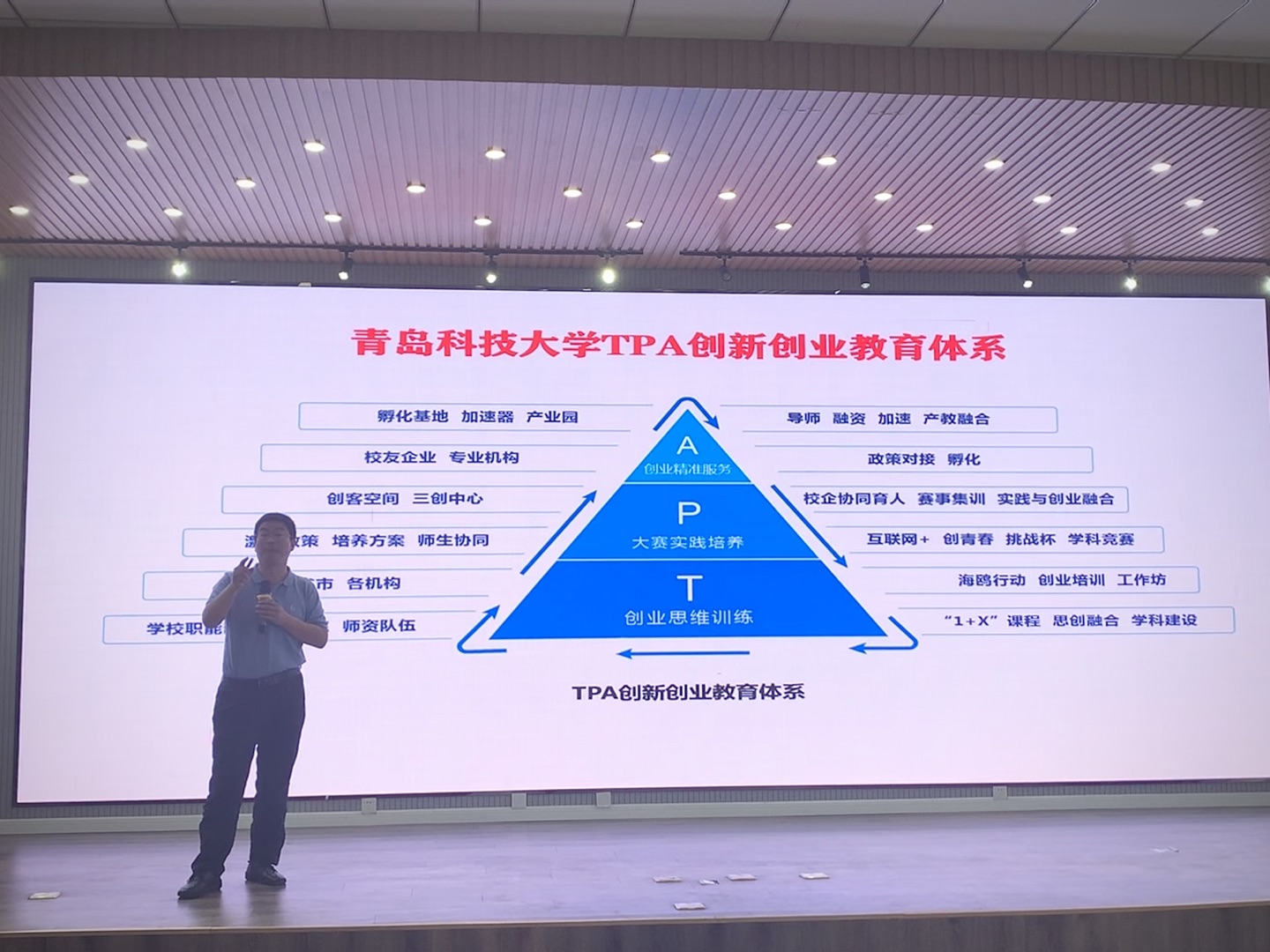 褚庆柱做了《TPA创新创业教育体系的构建与实践》讲座。从创业思维训练、大赛实践培养、创业精准服务三个方面,讲解如何培养创意思维,提高创新能力,发掘创业人才。传达了《青岛科技大学生学科竞赛管理办法》的文件精神,对如何参加大赛“互联网+”大赛进行了详细解读。