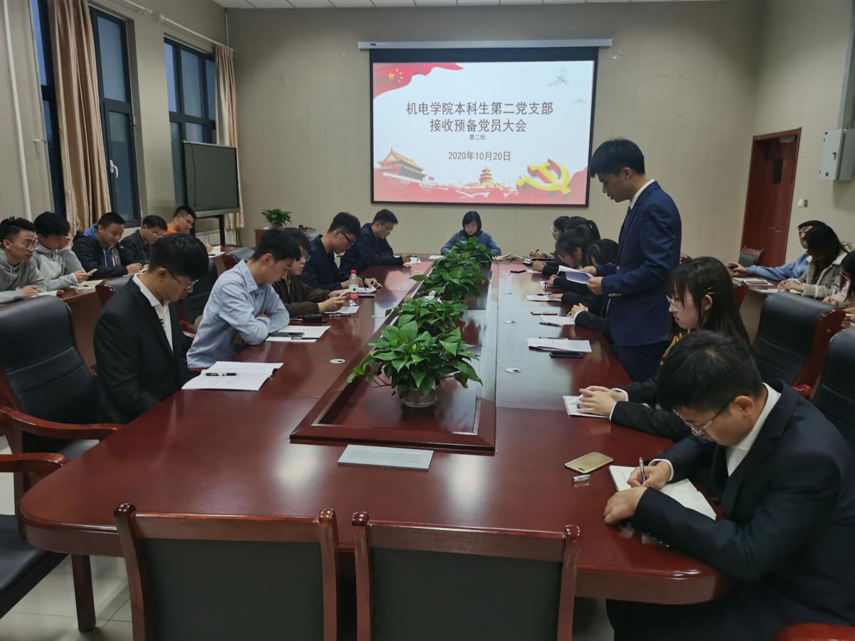 10月20日下午,Beat365官方网站本科生第二党支部在机电楼518会议室隆重召开接收预备党员支部大会,支部全体党员参加会议,会议由支部书记王娟娟主持。