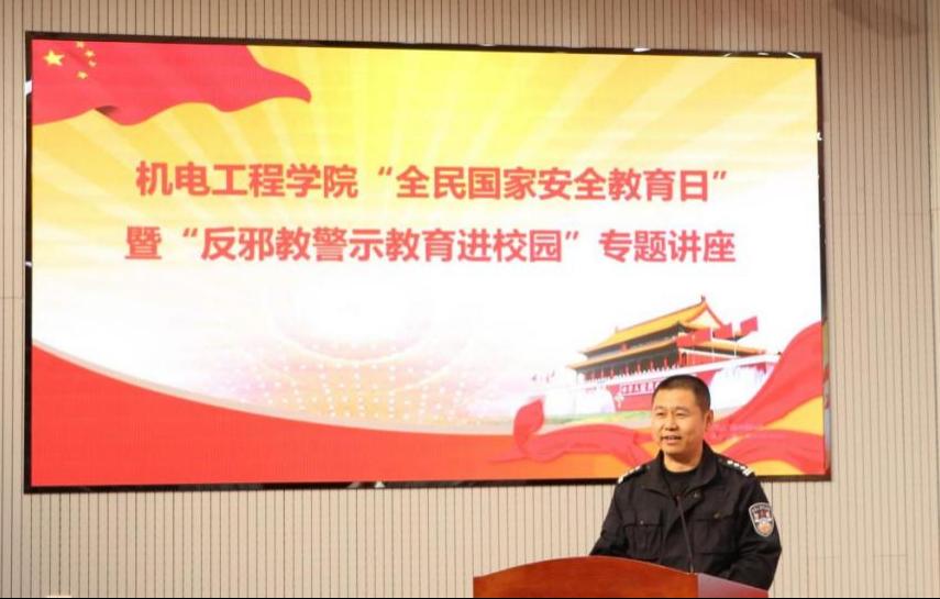 4月15日下午,Beat365官方网站在D3楼530会议室举行全民国家安全教育日主题教育暨反邪教警示教育进校园专题讲座。青岛市崂山区公安局反恐大队队长辛华忠、学校保卫处副处长严增兴、学院党委副书记兼副院长肖强以及学院师生代表180名参加活动。
