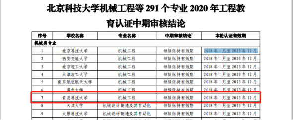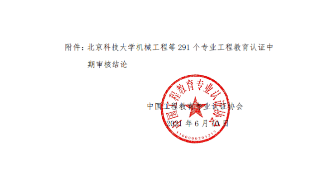 近日,中国工程教育专业认证协会发布了《关于公布北京科技大学机械工程等291个专业工程教育认证中期审核结论的通知》,Beat365官网机械工程和过程装备与控制工程两个专业在列,审核结论为“继续保持有效期”,本轮认证有效期为“2018年1月至2023年12月”。