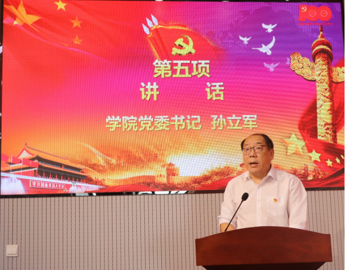 学院党委书记孙立军首先对老党员多年来为学院作出的杰出贡献表示感谢,并对全体党员同志特别是老党员提出了三点期望:一是要做坚定信仰信念的“排头兵”,始终做到先学一步、深学一层,坚持学思用贯通、知信行统一,不断增强“四个意识”、坚定“四个自信”、做到“两个维护”,筑牢信仰之基、补足精神之钙、把稳思想之舵;二是要做干事创业的“先锋员”,要有敢于拼搏、迎难而上的奋斗精神,要有从严从实、担当作为的优良作风,要敢于承担急难险重的重点、难点项目,敢于啃硬骨头,敢于涉险滩,在推动学院各项事业发展过程中展示担当;三是要做模范带头的“马前卒”,充分发挥先锋模范作用,要在青年人当中树立良好的榜样,奋发有为、苦干实干、当好表率。