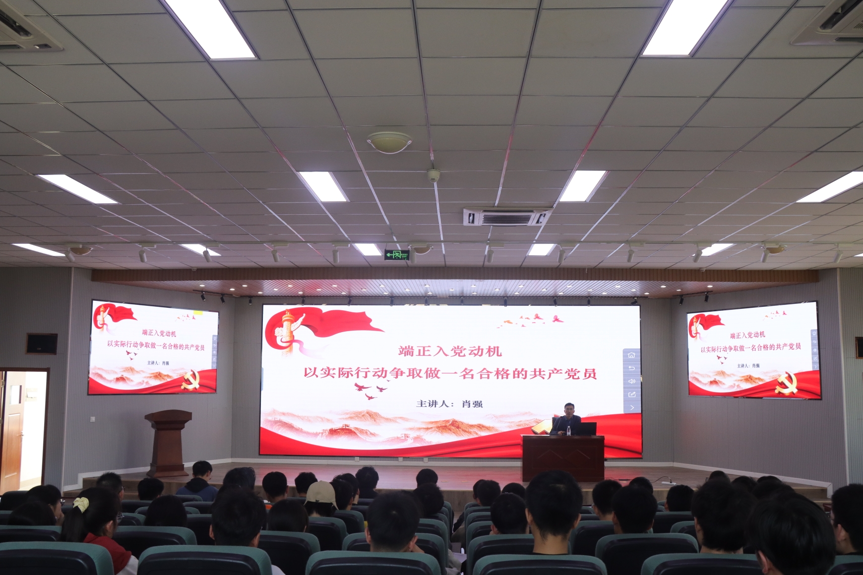 肖强从党史、领袖对待入党动机的看法,学生自身如何以实际行动争取做一名合格的共产党员三个方面展开讲授,深入浅出的以实际案例为学生进行了生动的讲解。在讲授过程中,肖强提出,作为新时代的青年学生,要牢牢树立正确的入党动机,坚定理想信念,深入学习贯彻习近平新时代中国特色社会主义思想和习近平总书记系列重要讲话精神;要以实际行动做到与时俱进,追求真理,勇于创新;要做到结合自身专业文化知识,积极参与科技创新,真正做到理论与实践相结合,发扬大国工匠精神。