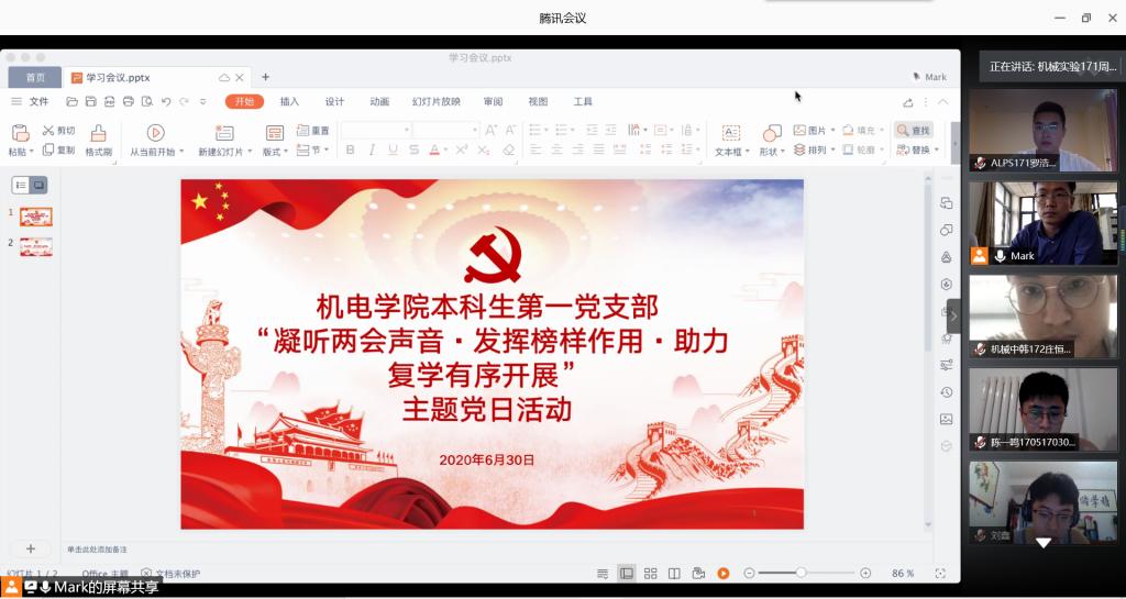 为更好地学习贯彻两会精神,弘扬战 “疫”精神,引导广大党员坚定理想信念、恪守党的宗旨,发挥党员的先锋模范作用。6月30日下午,Beat365官方网站本科生第一党支部召开“凝听两会声音·发挥榜样作用·助力复学有序开展”主题党日活动。本科生第一党支部全体党员参会,会议由党支部王玉凯老师主持。