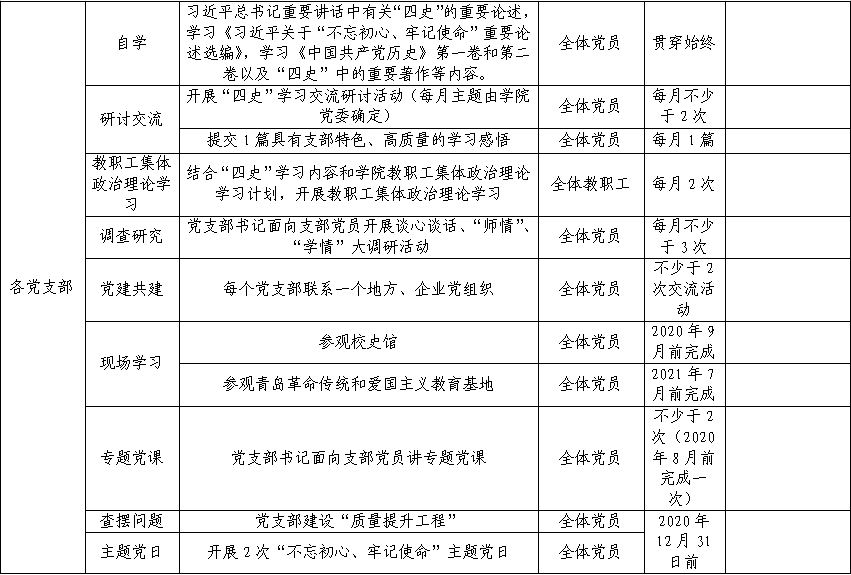 (一)把“‘四史’学习年”作为推动学院“不忘初心、牢记使命”制度化建设的重要载体。巩固“不忘初心、牢记使命”主题教育成果,推动建立不忘初心、牢记使命长效机制,坚持自学与集中学习相结合,坚持线下研讨与在线学习相结合,坚持实践学习和理论学习相结合,坚持党委理论学习中心组与教职工集体政治理论学习两手抓,不断规范学习内容与学习形式。把“四史”作为党员领导干部、师生日常教育学习的重要内容,作为党支部组织生活的重要内容。根据学习内容,定期开展交流活动,党员领导干部要带头学习,学院党委理论学习中心组每月开展集中学习不少于2次,学院领导班子成员每月参加所联系党支部组织生活不少于1次,各支部学习交流活动每月不少于2次,党支部书记至少讲2次专题党课,开展2次“不忘初心、牢记使命”主题党日。