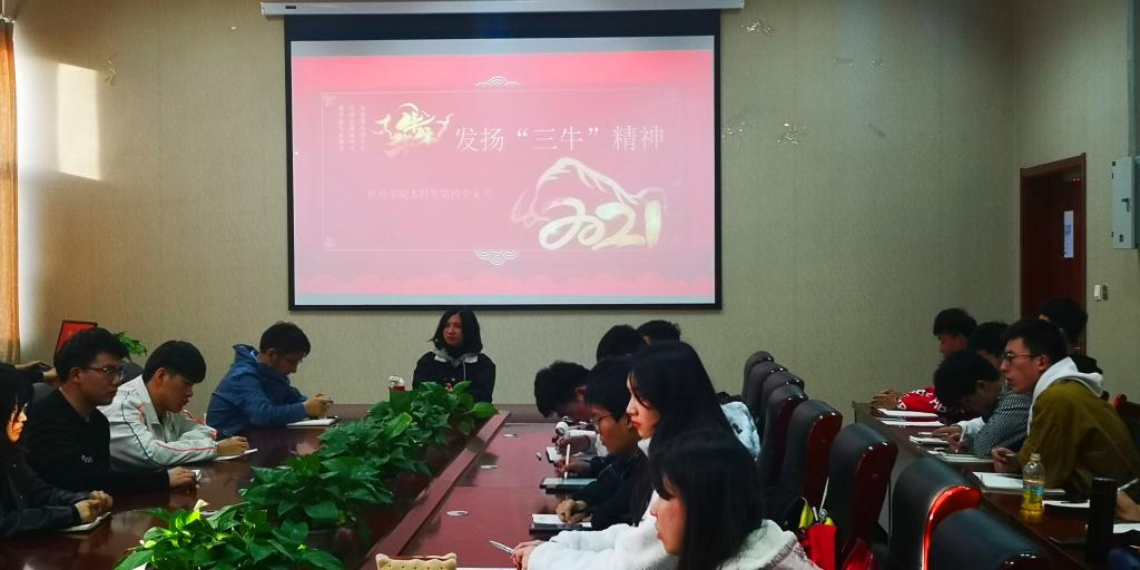 3月23日,结合习近平总书记日前在全国政协新年茶话会上的讲话精神,Beat365官方网站本科生第四党支部召开“发扬”三牛”精神,凝心聚力干事,全面开创学校高质量发展新局面”主题党日活动。会议由党支部书记孙坤岩主持。