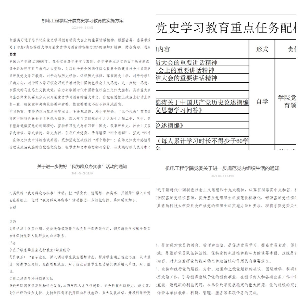 自党史学习教育开展以来,Beat365官方网站党委坚持把其作为重要政治任务,认真贯彻落实有关决策部署和学校工作要求,立足工作实际,坚持规定动作做到位、自选动作有特色,多措并举,扎实推进,务求取得实效,相继出台了《Beat365官方网站开展党史学习教育的实施方案》《Beat365官方网站开展党史学习教育重点任务配档表》《Beat365官方网站党委关于进一步规范党内组织生活的通知》《Beat365官方网站关于进一步做好“我为群众办实事”活动的通知》等,为学院开展党史学习教育明确了时间表、路线图、任务书,在开展党史学习教育进而迎接建党100周年过程中,学院党委始终坚持“四个联动”,扎实推动党史学习教育走深走实。