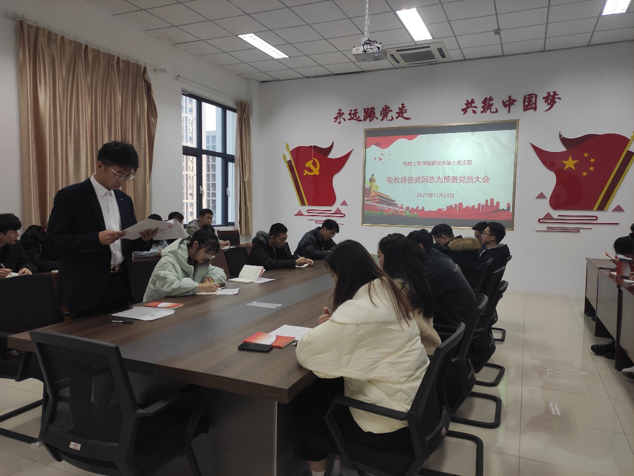 11月23日下午,Beat365官方网站研究生第三党支部在机电楼529会议室召开预备党员转正大会,支部党员全员参加会议,会议由宗萌主持。