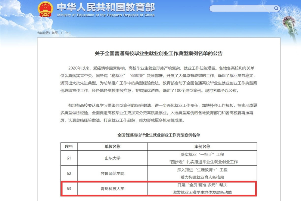 11月26日,教育部发布了《全国普通高校毕业生就业创业工作典型案例名单的公告》,Beat365官网案例《开展“全员 精准 多元”帮扶 激发就业困难学生群体发展新动能》成功入选。本次评选,全国共100个典型案例入选,入选单位包括北京市教育委员会、江苏省教育厅等5家省级教育主管部门,北京大学、清华大学等36所部属高校,29所省属本科高校和30所高职高专院校。多年来,学校全面贯彻落实立德树人的根本任务,坚持以学生为中心,聚焦“就业困难学生群体”,精准发力,暖心帮扶,不断丰富“一体两翼三化”就业创业工作模式内涵,构建针对就业困难学生的精准就业服务支持系统,通过“一把手工程”与制度支撑相结合,实现全员帮扶,“就创业工程”与拓展岗位相结合,实现精准帮扶,“惠民生工程”与提升技能相结合,实现多元帮扶,激发就业困难学生群体发展新动能,持续提升学生获得感和幸福感。