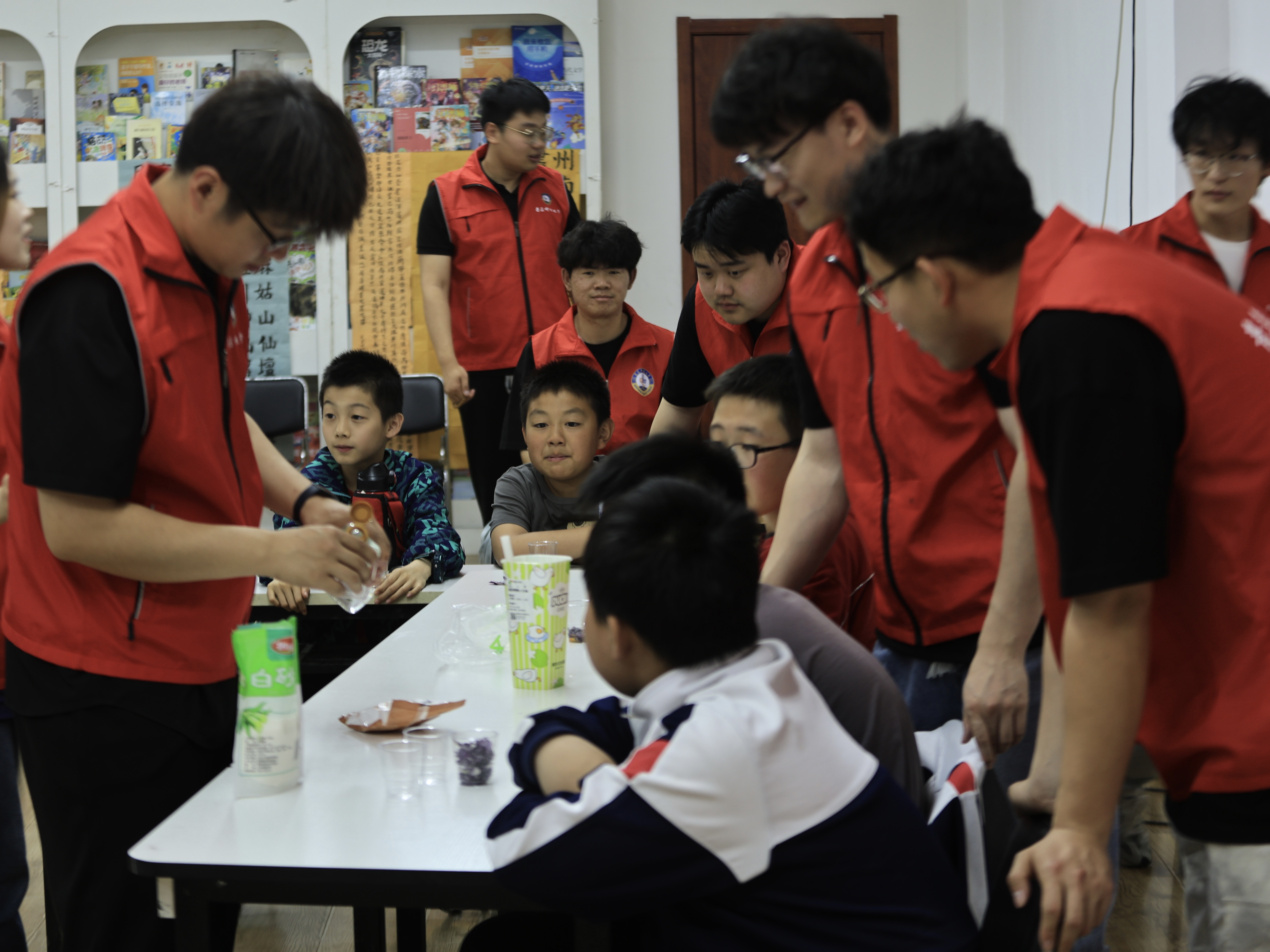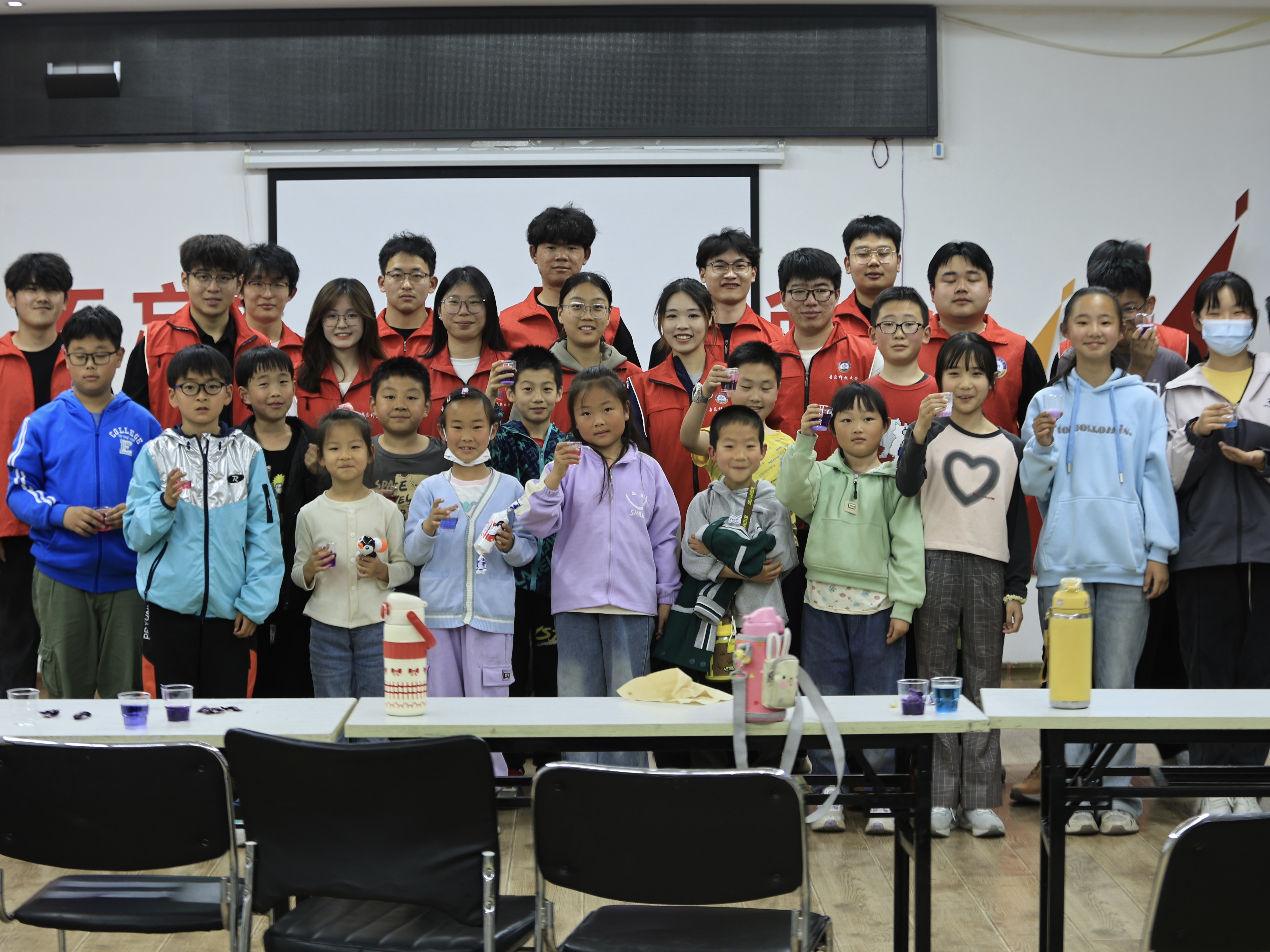课堂上,刘佳琪和王泽欣通过PPT向小朋友们展示了紫甘蓝指示剂变色的神奇原理,同时通过互动问答的方式将指示剂的制作方法及不同的变色现象介绍给小朋友们,极大地调动了小朋友们的学习热情。在实际操作过程中,志愿者们积极引导小朋友们,通过共同合作及实操讲解,加深其对知识的理解和体验成功的喜悦。