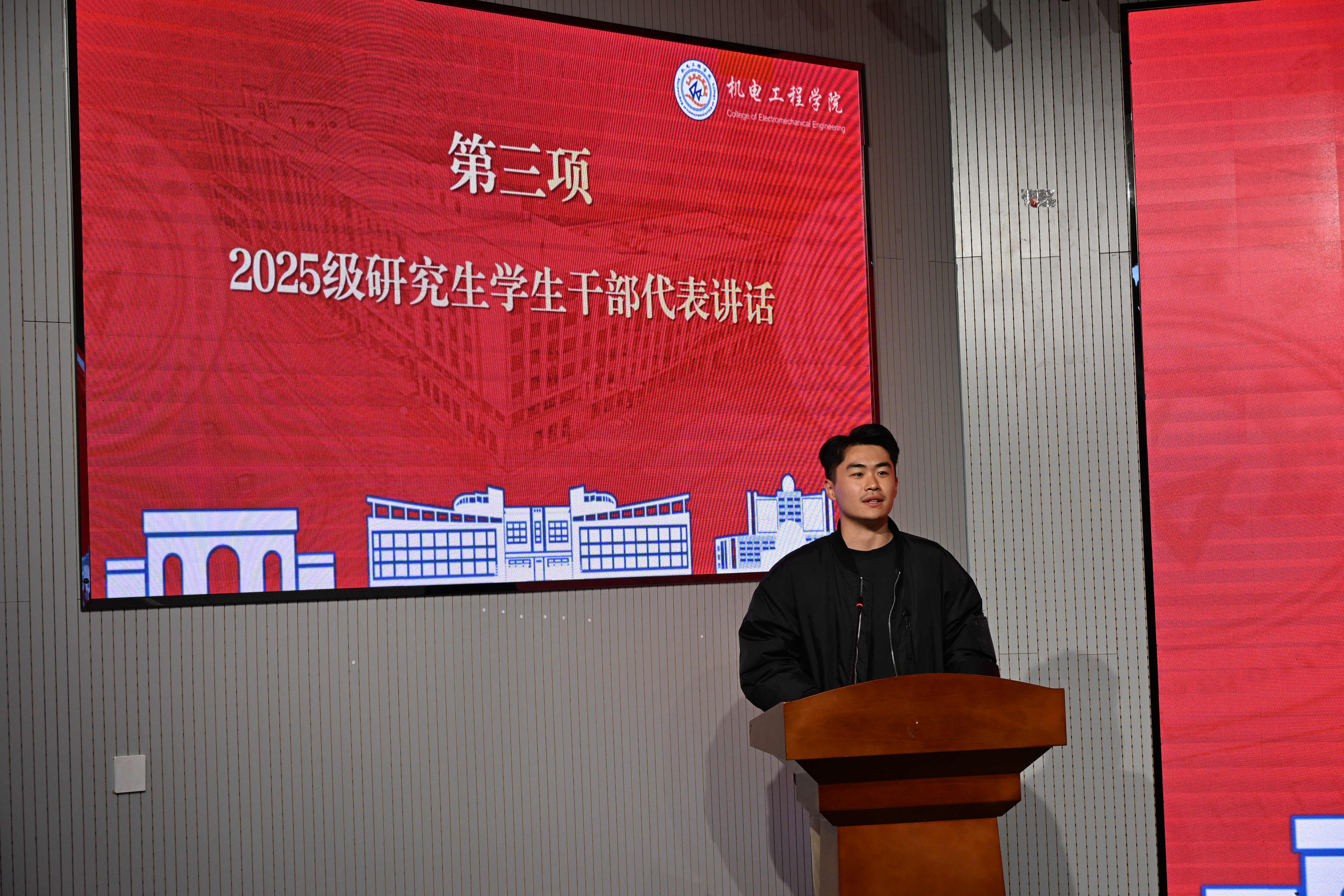 在主题团课上,逄柏鹏为2025级研究生团学干部代表颁发聘书,并代表学院团委向全体研究生团学干部表示祝贺,结合学校学院实际,围绕团学工作使命,提出四点希望:一是筑牢思想根基,提升引领力,以理想信念为舵,做传递价值导向、凝聚青春力量的“机电排头兵”;二是强化协作意识,锤炼组织力,主动担当作为,成为推动学院各级团组织建设提质增效的“关键抓手”;三是坚守服务初心,增强服务力,牢记“全心全意为同学服务”的宗旨,脚踏实地为同学办实事、解难题;四是立足长远发展,提升贡献度,在科研创新、学科竞赛、志愿服务等领域勇当先锋,以实际行动彰显新时代研究生的青春底色与责任担当。