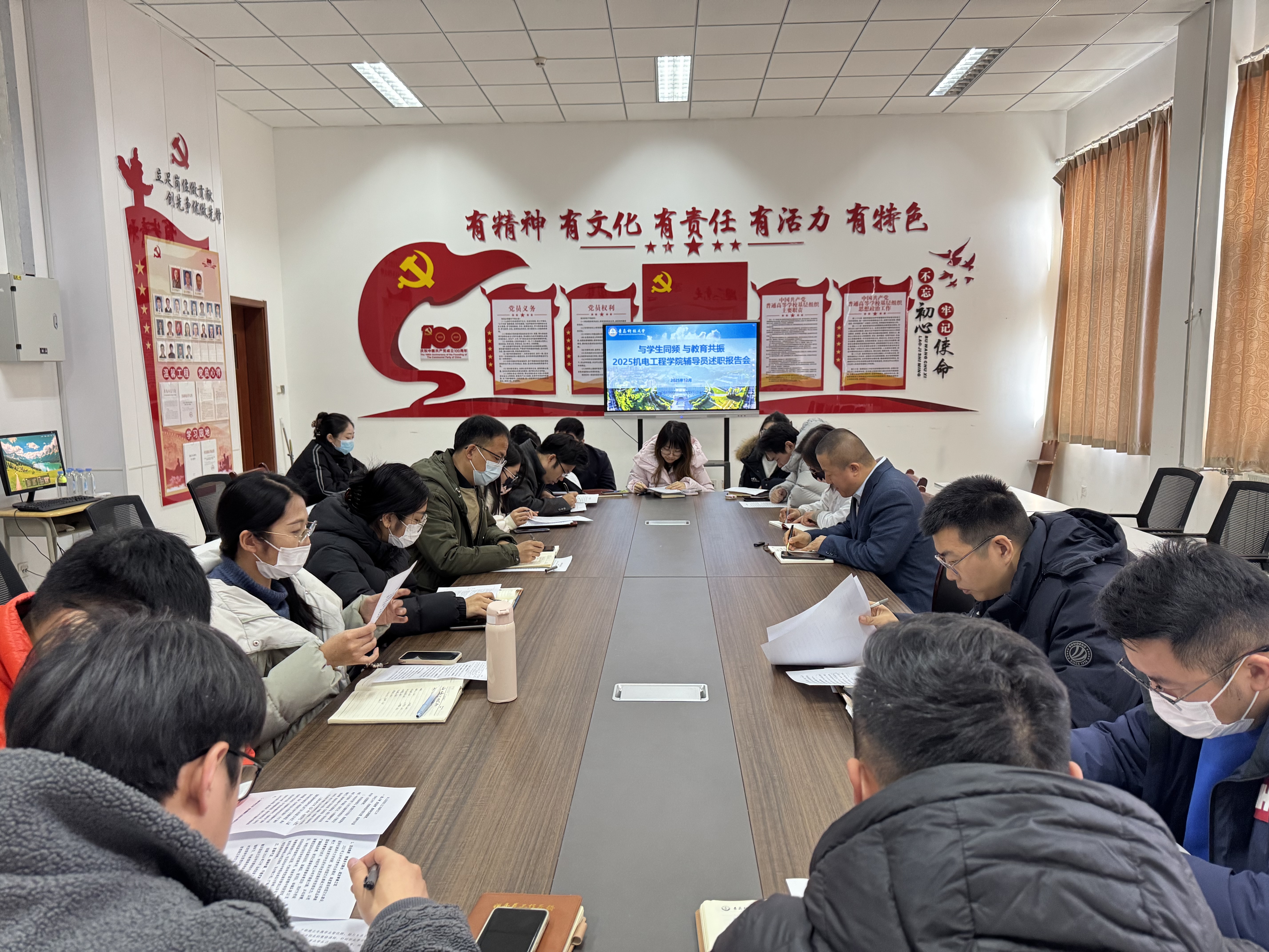 12月16日,Beat365官方网站在机电楼党建活动室组织2025年度专职辅导员述职报告会。学院党委副书记杨小明参加会议并讲话,副院长张卫锋、教师代表白杨、校党委宣传部理论教育科正科级干事王乐昌受邀参会,全体专兼职辅导员参加会议并依次述职。
