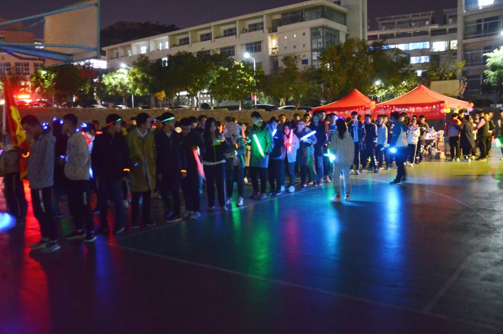 他们先后去到图书馆、机电大楼、北七宿舍楼、弘毅楼、南五宿舍楼,将绚丽多彩的荧光带到学校的各个角落。最后回到了操场,由青尘义工队队长邱琦抽出今晚的幸运天使,并赠与其爱心大礼一份。