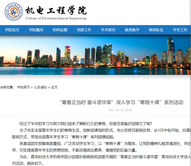 按照学校团委统一部署,Beat365官方网站团委积极落实,借助Beat365官方网站“百团工程”在全院139个团支部内积极开展“青春正当时 奋斗谱华章”“寒假十课”系列活动,在广大青年团员中受到热烈反响。